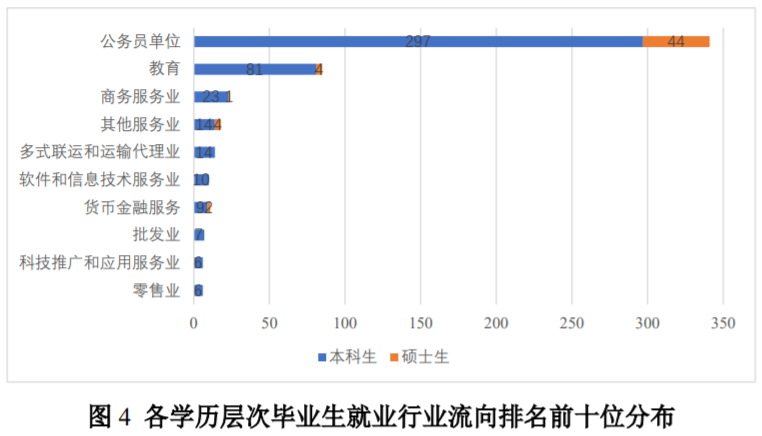 分学历来看,硕士毕业生 主要流向了公务员单位、教育、其他服务业,合计占比 70.27%;本科毕业生主要流向了公务员单位、教育、商务服务业,合 计占比 66.83%。其中主要流向上海市,本科和硕士毕业生分别占比为 36.50%、32.43%。