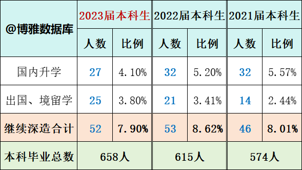 2023 届毕业生中,国内升学 28 人,双一流大学建设高 校深造 10 人,占国内升学人数 35.71%。