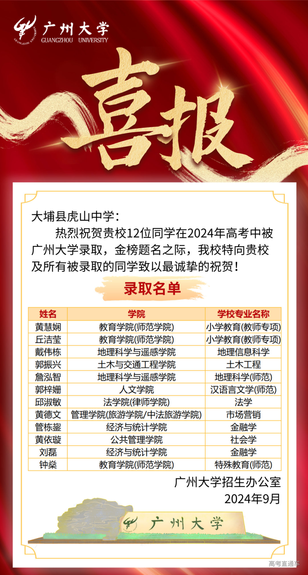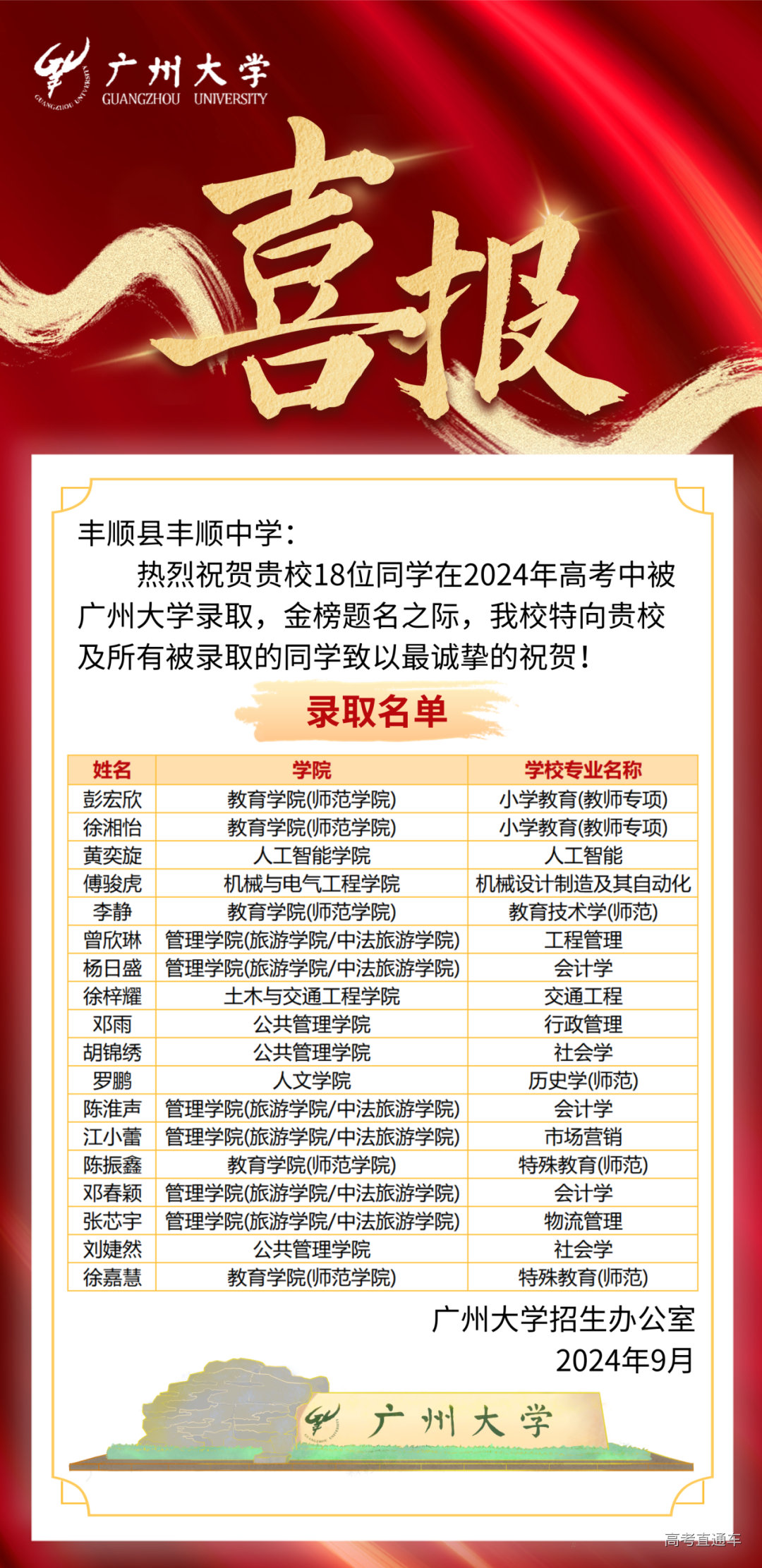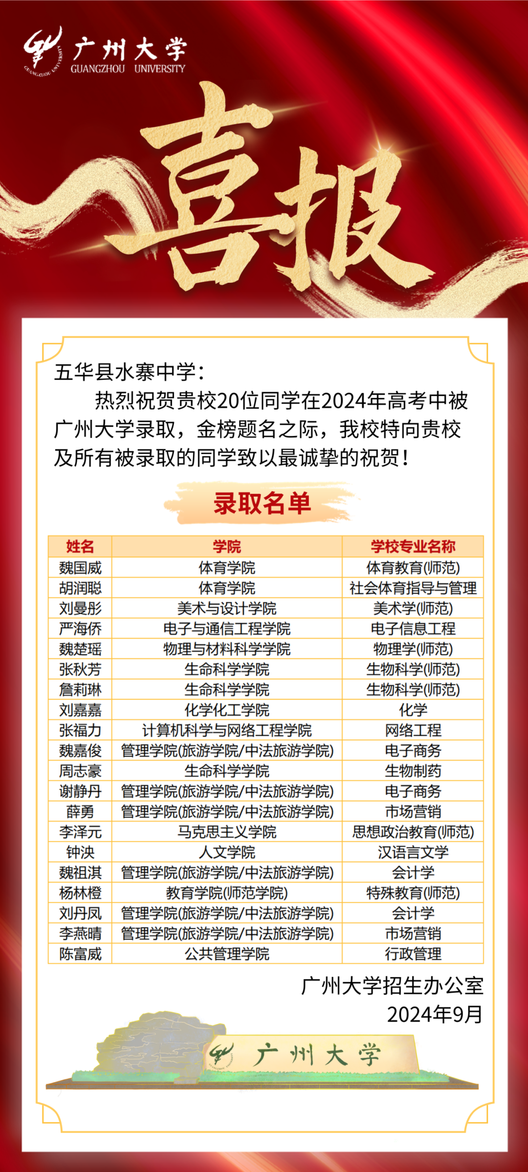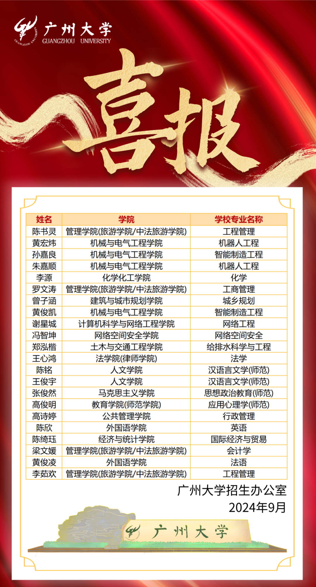 2024年招生工作已顺利结束。我校满怀感激之情,衷心感谢各生源中学一直以来对广州大学招生工作的支持,向我校不断输送优秀学子。