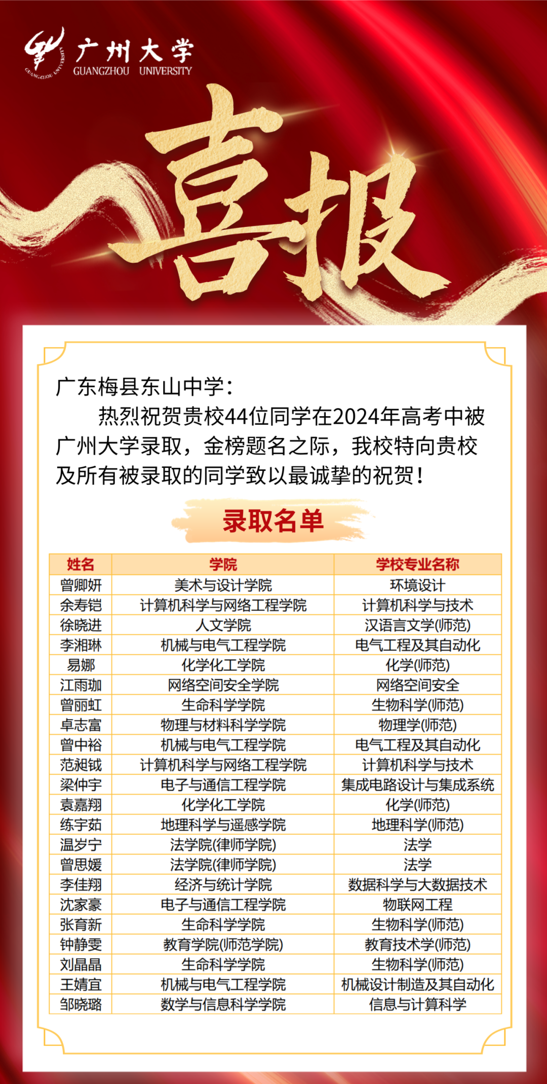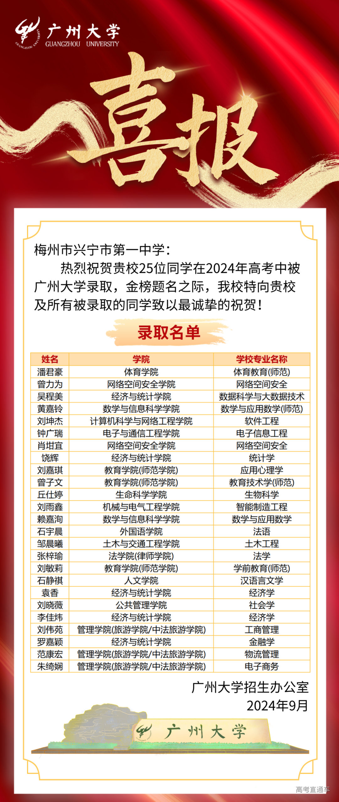 下面是2024年我校在梅州市录取详情(录取人数10人及以上,按人数排序),欢迎更多优秀学子加入广州大学,再次向这些生源中学致谢!祝贵校高考再创佳绩!