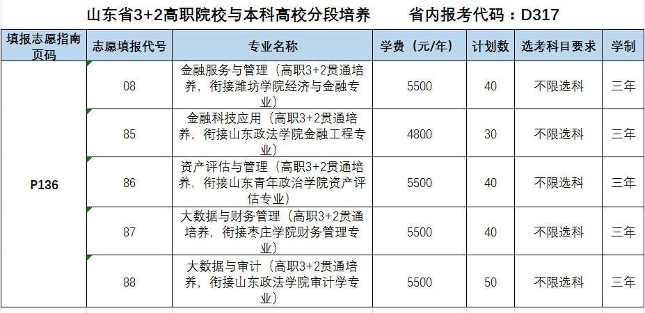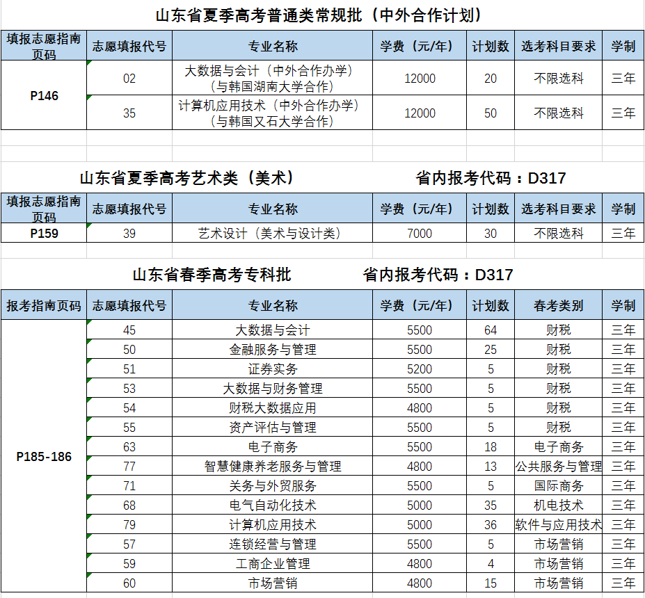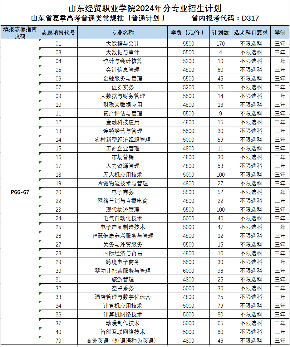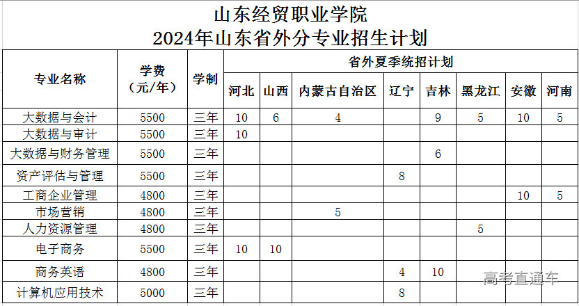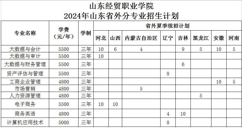 山东经贸职业学院2024年面向全国9省共设置招生专业37个,招生计划3550人。其中,山东省内春季高考招生计划240人,主要设有财税、市场营销、电子商务、机电技术、软件与应用技术、公共服务、国际商务等7个专业类别14个招生专业;山东省内夏季高考招生计划1820人,分为普通类常规批普通计划、中外合作办学计划、3+2分段培养计划,艺术类(美术)专科批计划;山东省外8省夏季高考招生计划140人。