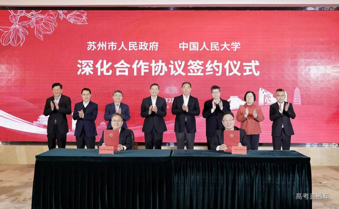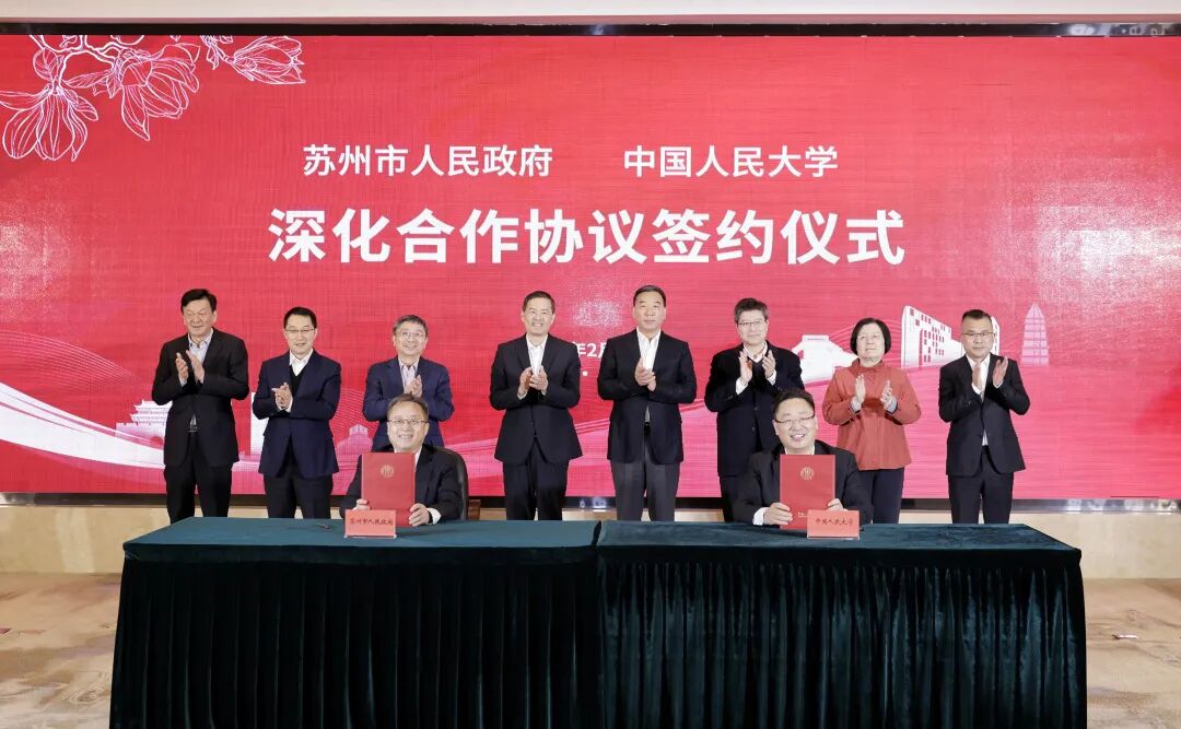 中国人民大学党委书记张东刚、校长林尚立,常务副校长、人大附中联合学校总校校长朱信凯,人大附中暨人大附中联合总校名誉校长刘彭芝;江苏省委常委、苏州市委书记刘小涛,江苏省教育厅厅长、党组书记、省委教育工委书记江涌,苏州市委副书记、市长吴庆文,苏州市委常委、常务副市长顾海东,苏州市委常委、苏州工业园区党工委书记沈觅,苏州市政府秘书长俞愉出席,中国人民大学副校长、苏州校区管理委员会主任郑新业主持。朱信凯、顾海东代表双方签署《苏州市人民政府 中国人民大学深化合作协议》。