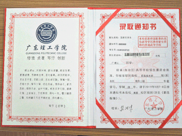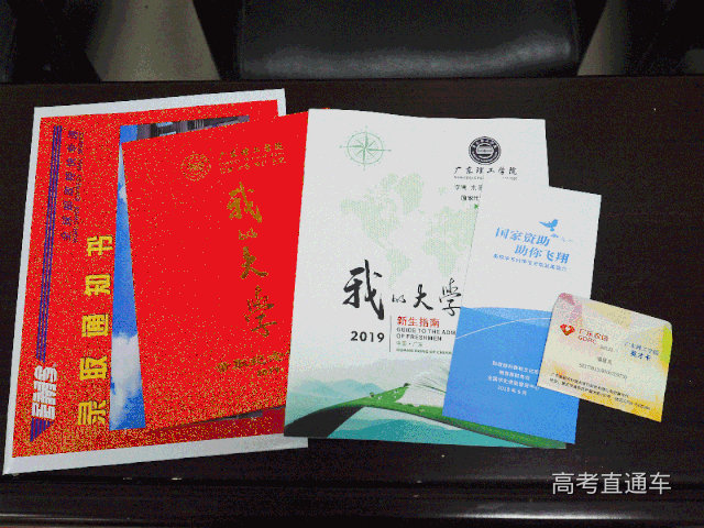 今年的通知书升级了~ 不再是单纯的薄薄一张纸 而是厚实的一本“书” 封面光滑的触感 谁摸谁知道 轻轻将录取通知书抽出 你会发现 里面其实还是个录取纪念证书 左边印着学校的校徽校训和荀子《劝学》 右边印着“我的大学”四个大字和我校科技广场剪影 且今年的的录取通知书不会回收 整套给同学们留作纪念 (但报道那天还是要带来扫码的哈!) 物品清单 1、录取通知书 2、2019新生入学须知(广理新生攻略) 3、英才卡(银行卡、饭卡、热水卡。。。) 4、国家助学贷款办理指南 5、...... 每一份录取通知书 都是经过招生办老师和助理仔细检查核对 经过一系列工序后 才会发出 在此致敬所有的工作人员 大家辛苦了ヘ(_ _ヘ) 第一批总共发出520份,也刚好是“我爱你” 如果您是520个幸运儿,中国邮政会短信通知哒。 tips: 1、同时也可在中国邮政速递物流EMS官网的“录取通知书查询”版块,根据考生本人的高考准考证号查询 2、其他批次的录取通知书也将根据各省、各批次录取进程,依次发出。 3、具体的录取专业、报到时间以及校区等,以学生收到的录取通知书上所写为准。提前报道也安排不了宿舍哦。