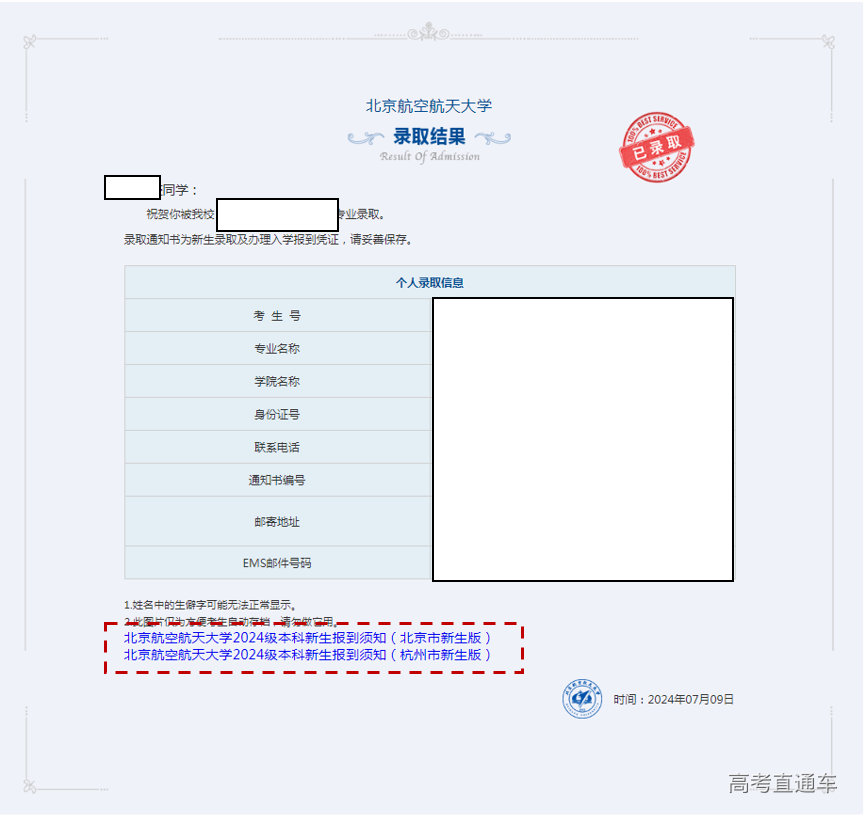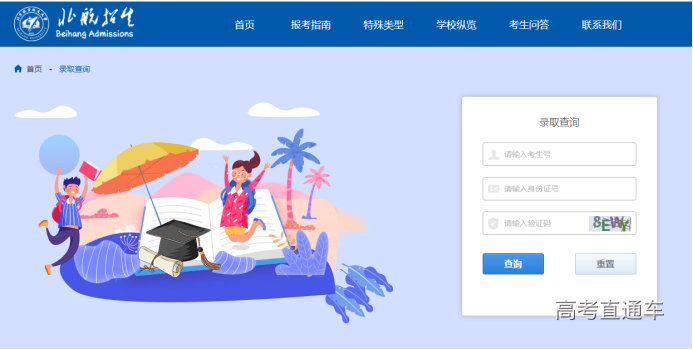 登录北航招生网(网址:http://zs.buaa.edu.cn/),点击首页“录取查询”,输入录取通知书上的考生号、身份证号即可查询。