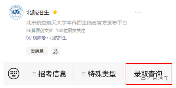微信搜索北航招生进入公众号点击“录取查询”进行查询。查询方式与官网相同。