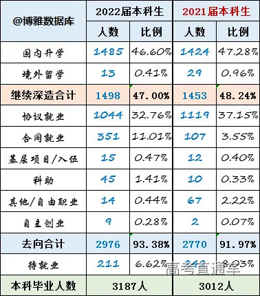 学校 2023 届共有本科毕业生 3566 人(含专升本),共有 1525 人选择升学深 造,升学率为 42.77%。公共卫生学院 2023 届本科毕业生升学比例最高,有 61.90 %的毕业生成功升学。对比 2023 届各专业本科生升学率,“妇幼保健医学” 专业的升学率最高,为 72.41%;其次是“预防医学”专业,升学率为 71.79%。