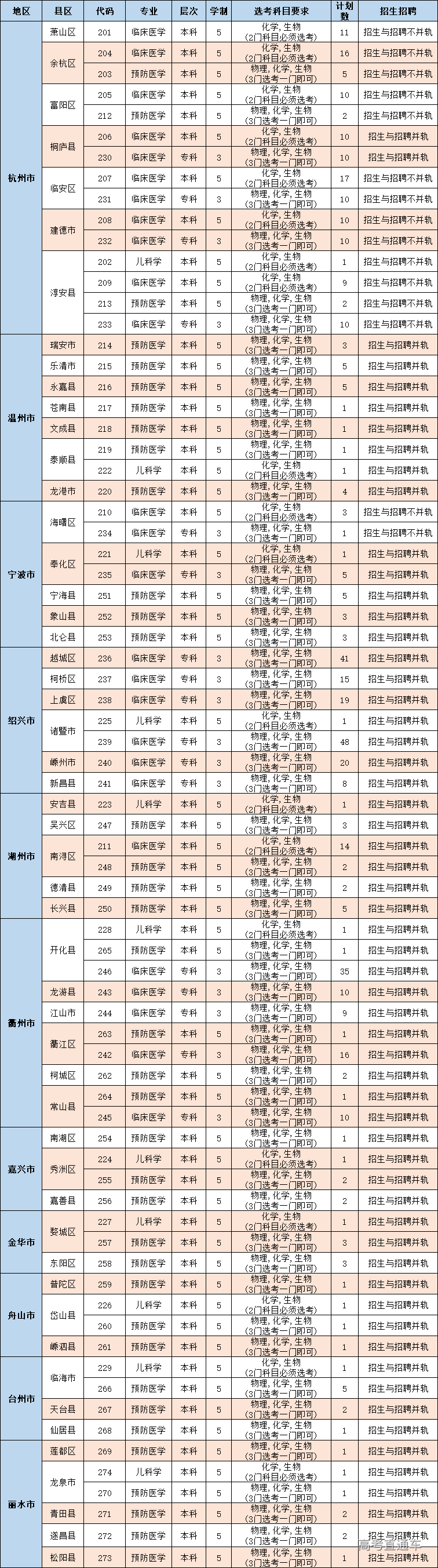 2020年杭州医学院继续承担基层卫生人才定向招生培养工作,计划招生474人,其中临床医学(五年制本科)100人,儿科学(五年制本科)11人,预防医学(五年制本科)86人,临床医学(三年制专科)277人,具体分县分专业计划见下表: