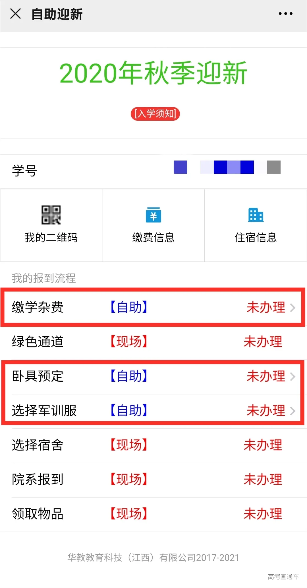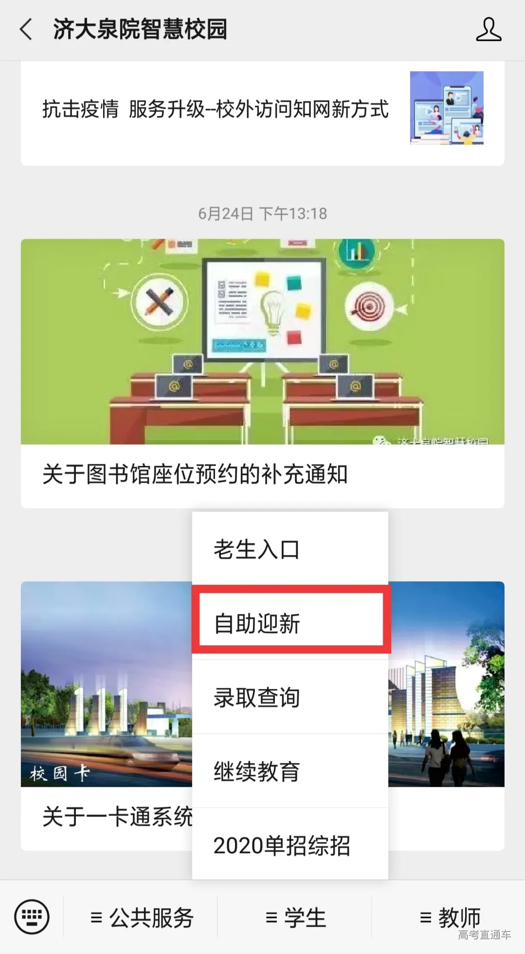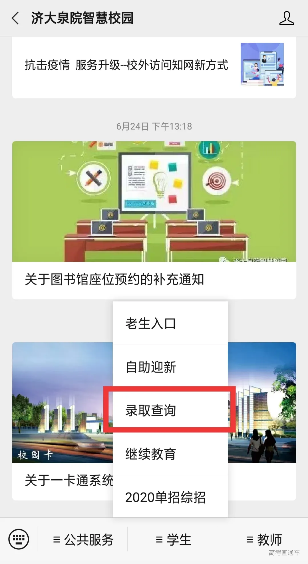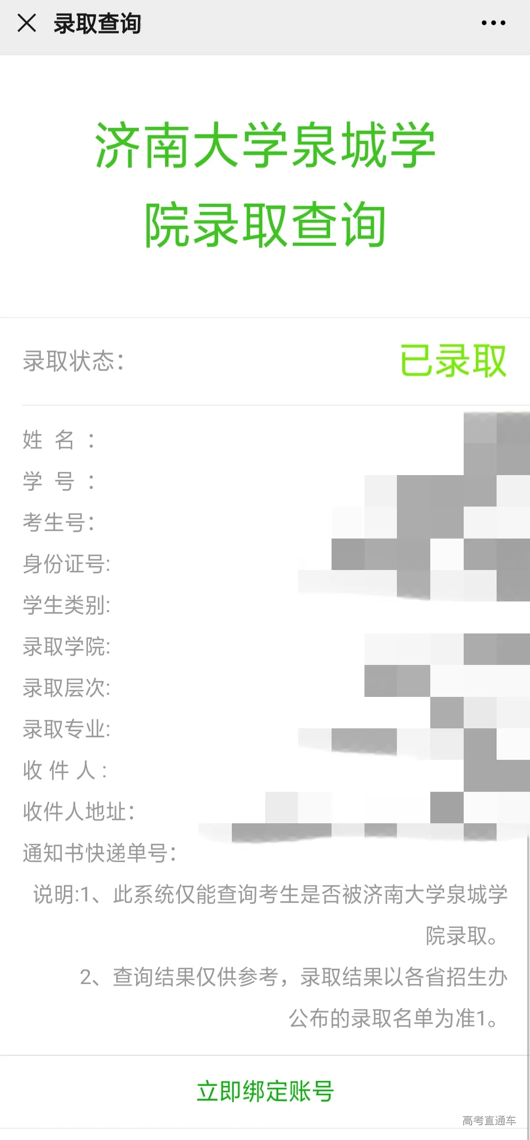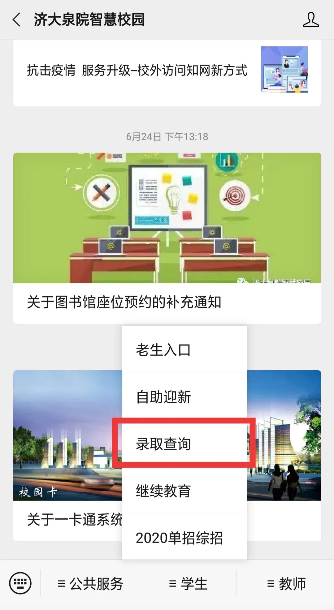 伴随着全国各省份各批次招生录取工作的陆续开展,已录取的考生们现在可以通过我校 济大泉院智慧校园 的官方微信菜单查询录取的实时动态。 热烈祝贺被录取的考生们,感谢你们的信任和选择,真诚期盼与你们相遇,在美丽的泉院,开启你们人生新的篇章。 其他批次录取工作正在紧张有序的进行中,大家不要着急,关注 济南大学泉城学院招生就业处的微信公众号 ,最新的录取信息会第一时间发布。 录取查询、自助迎新系统使用说明 01 微信搜索或扫码关注。 济大泉院智慧校园微信公众号 02 点击学生端,选择录取查询。 03 三种查询方式任选其一。 04 进入录取状态确认界面。 05 信息确认后选择立即绑定账号。 06 完成绑定后,返回主界面,再次点击学生——自助迎新。 07 在此界面依次完成三项自助步骤。 08 确认缴费信息并填写手机号,通过微信或支付宝均可缴费。 09 完成缴费后,返回上一界面依次完成卧具预定和军训服预定。 温馨提示:考生们还可通过所在省份教育招生考试院公布的高考录取查询方式查询。(各省教育招生考试院查询录取结果的时间相对较晚,通常在该批次所有高校都结束录取后公布结果) 关 于 录 取 通 知 书 寄 放 每批次录取通知书寄发后,我们将第一时间在“济大泉院智慧校园”官方微信录取查询页面更新快递单号,大家可以再次登录查询快递单号。 我们也会通过“济南大学泉城学院招生就业处”官方微信及时发布寄发录取通知书的省份和批次,请大家耐心等待哦~ 我们在济南大学泉城学院静待萌新们的到来!
