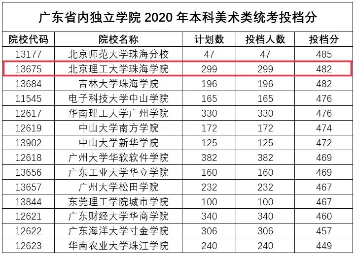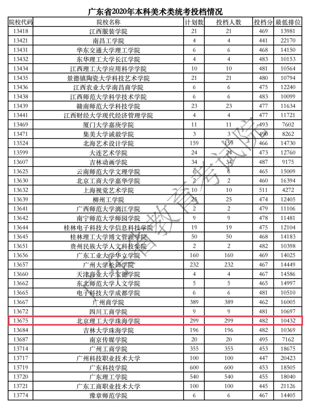 北理珠录取情况 投档最低分482,最低排位10432 投档最高分504,最高排位5479 其中视觉传达设计专业较为热门,投档最低分485,最低排位9492;投档最高分专业:数字媒体艺术。 ▸我校广东美术类投档分位列省内同类院校第二。 综合总分计算方式 广东省美术类专业录取时,在高考文化成绩和术科统考成绩双上线的基础上,按综合分从高分到低分录取。如综合分相同时,按排位从高到低顺序录取。