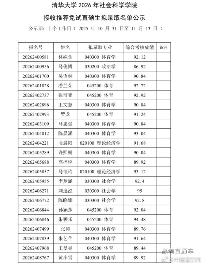 上个月,清华大学2026年社会科学学院接收优秀应届本科毕业生免试攻读研究生综合考核名单公示,中国乒乓球队运动员孙颖莎、王曼昱榜上有名。