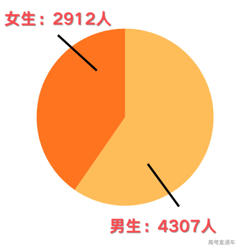 男生4307人,占比59.7% 女生2912人,占比40.3% 男生:女生≈1.48:1 男女比例相对均衡
