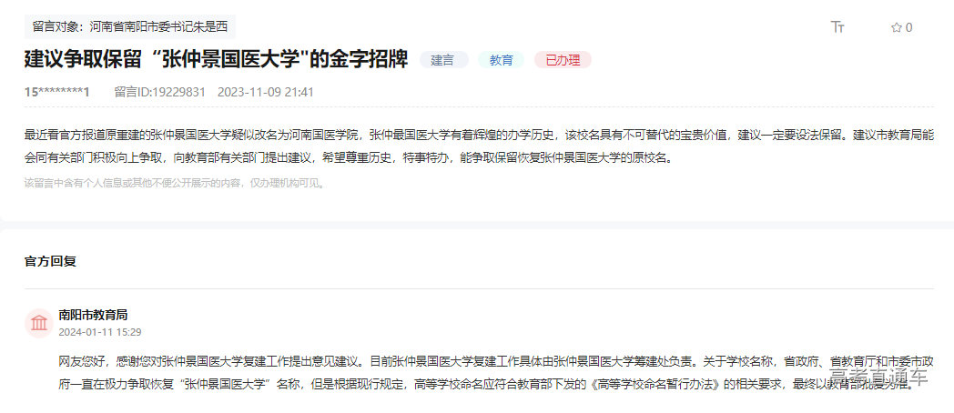 近日,有网友在人民网领导留言板建议争取保留“张仲景国医大学"的金字招牌,对此,南阳市教育局回复称,目前张仲景国医大学复建工作具体由张仲景国医大学筹建处负责。关于学校名称,省政府、省教育厅和市委市政府一直在极力争取恢复“张仲景国医大学”名称,但是根据现行规定,高等学校命名应符合教育部下发的《高等学校命名暂行办法》的相关要求,最终以教育部批复为准。
