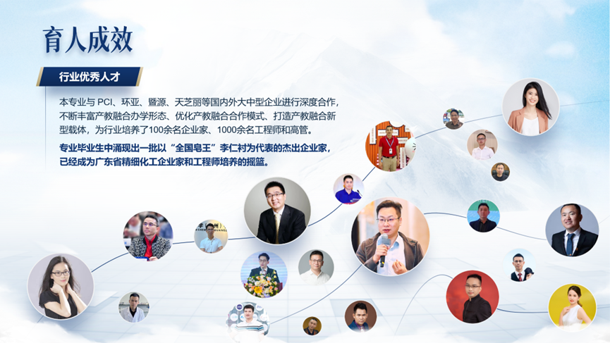 现代精细化工技术专业(本科)是国家“双高计划”高水平专业群核心专业精细化工技术升格而来,拥有教育部绿色日用化工技术应用协同创新中心、广东省绿色日用化工工程技术研究中心、广东省示范性产教融合实训基地等实验实训平台,组建了一支以国家“万人计划”领军人才、国家教学名师、珠江学者为引领的高水平师资团队,该团队是国家级教师教学创新团队、全国高校黄大年式教师团队,专注服务于湾区精细化工产业高端。本专业在“金平果”竞争力排行榜中连续多年位列全国第一,具有深厚办学底蕴和社会影响力。