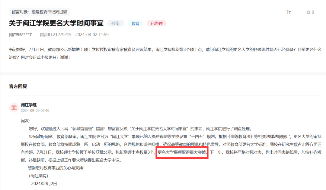 7月31日,教育部公示新增博士硕士学位授权审核专家核查及评议结果,闽江学院拟新增3个硕士点,请问闽江学院的更名大学的各项条件是否已经具备?目前更名什么进度?何时会正式申报更名?谢谢!