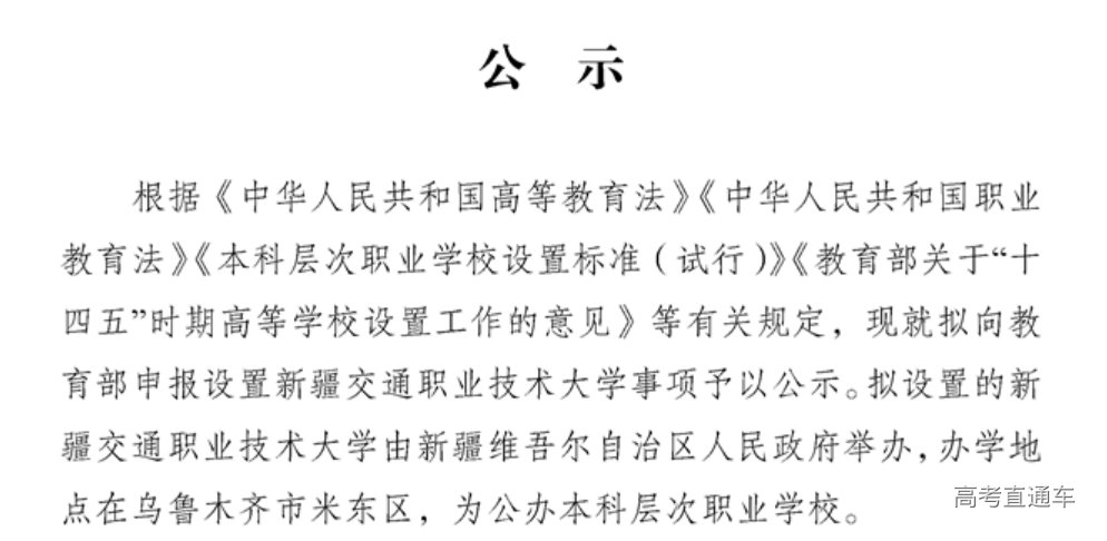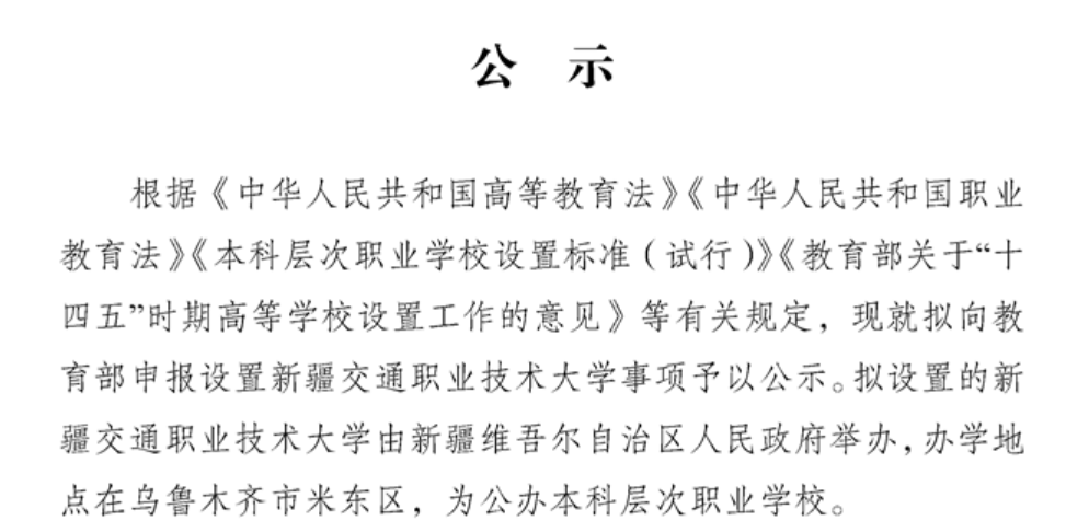 新疆维吾尔自治区教育厅发布公示,拟向教育部申报以新疆交通职业技术学院为基础设立新疆交通职业技术大学。拟设置的新疆交通职业技术大学由新疆维吾尔自治区人民政府举办,办学地点在乌鲁木齐市米东区,为公办本科层次职业学校。