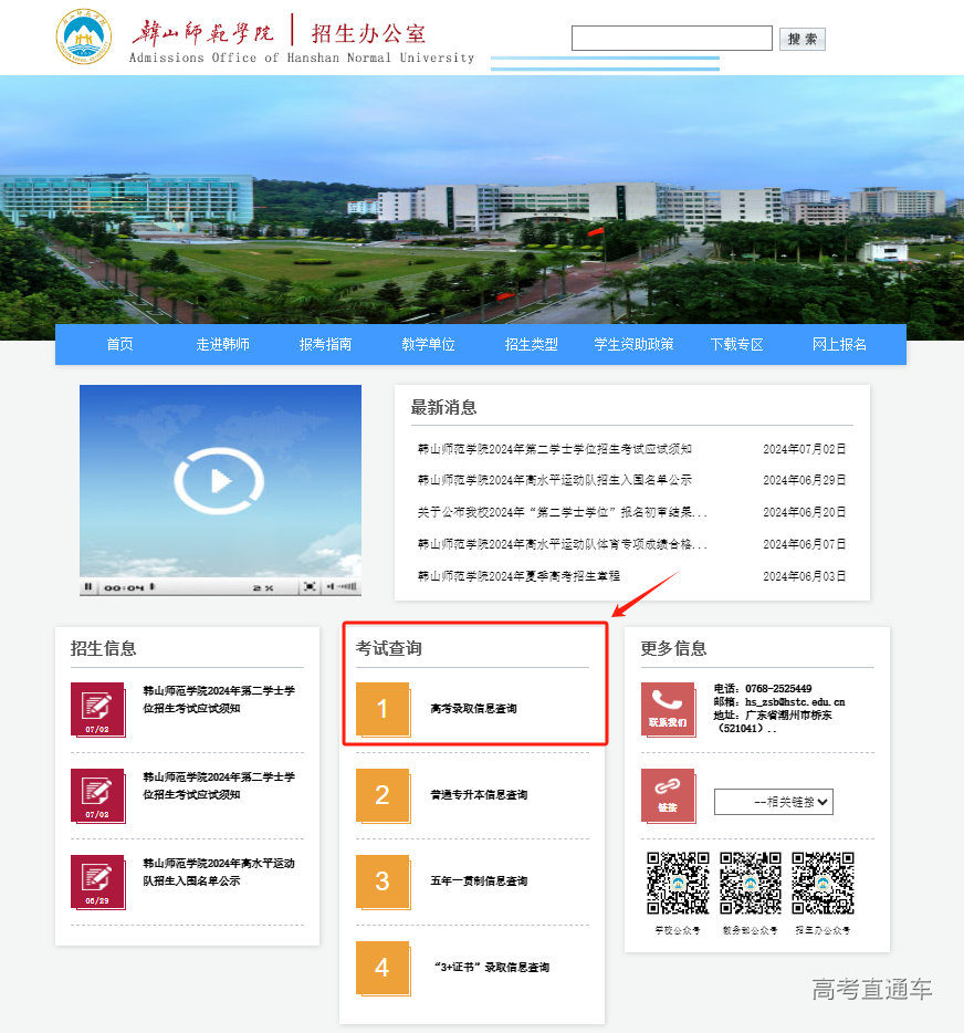 韩山师范学院2024年普通高考录取工作根据各省(区、市)安排的录取时间持续进行中,经各省(区、市)招办审核批准的录取结果将在我校招生办官方渠道公布。目前,已完成录取工作的省份各批次各科类如下表,考生可自行登录查询录取信息。 登录招生办网站后点击“高考录取信息查询 ”,输入14位考生号及身份证号后即可查询。 网址:https://zsb.hstc.edu.cn/ 点击文末“阅读原文”也可立即跳转至韩山师范学院录取情况查询系统。 1.所有考生查询请输入14位考生号,身份证号码中有X的请输入大写的,港澳台身份证含括号的请输入英文括号。 2.广东省外考生请用14位考生号,广东省考生请用“2444+10位考生号”进行查询。 点击“韩山师范学院招生办公室”公众号下方菜单栏“录取查询”,即可跳转至韩山师范学院录取情况查询系统。
