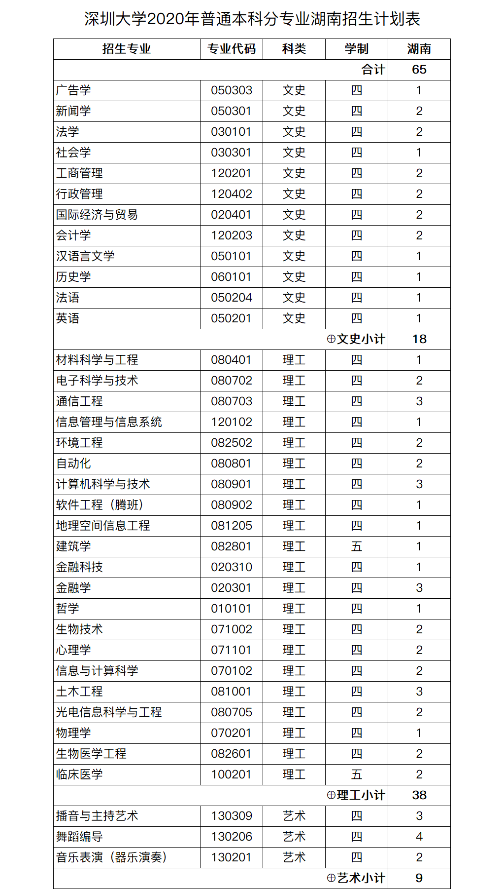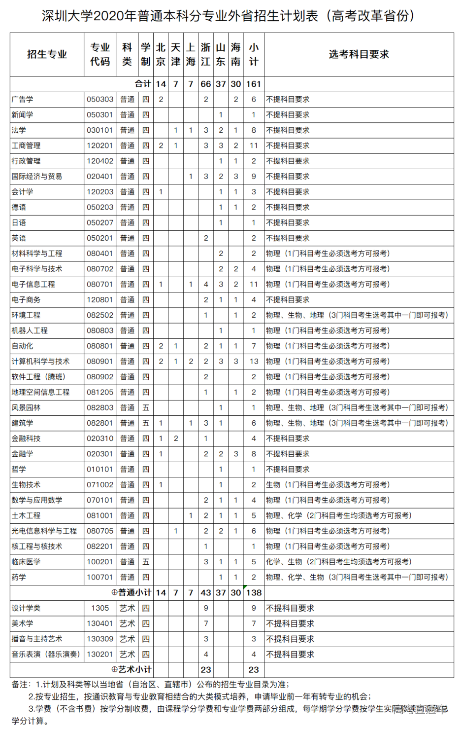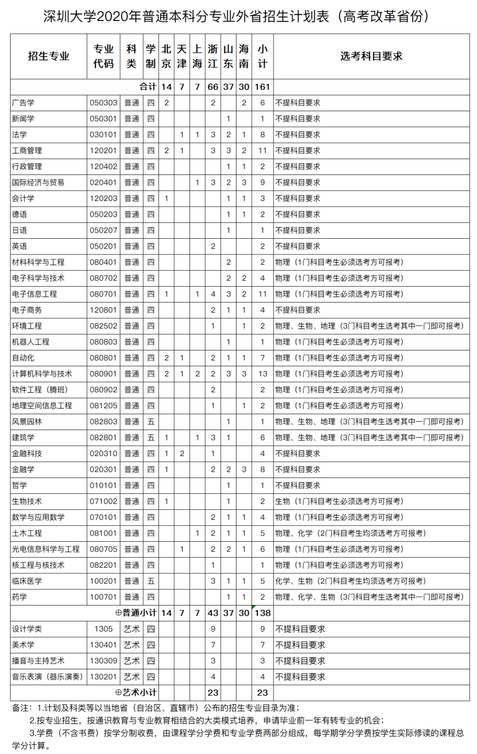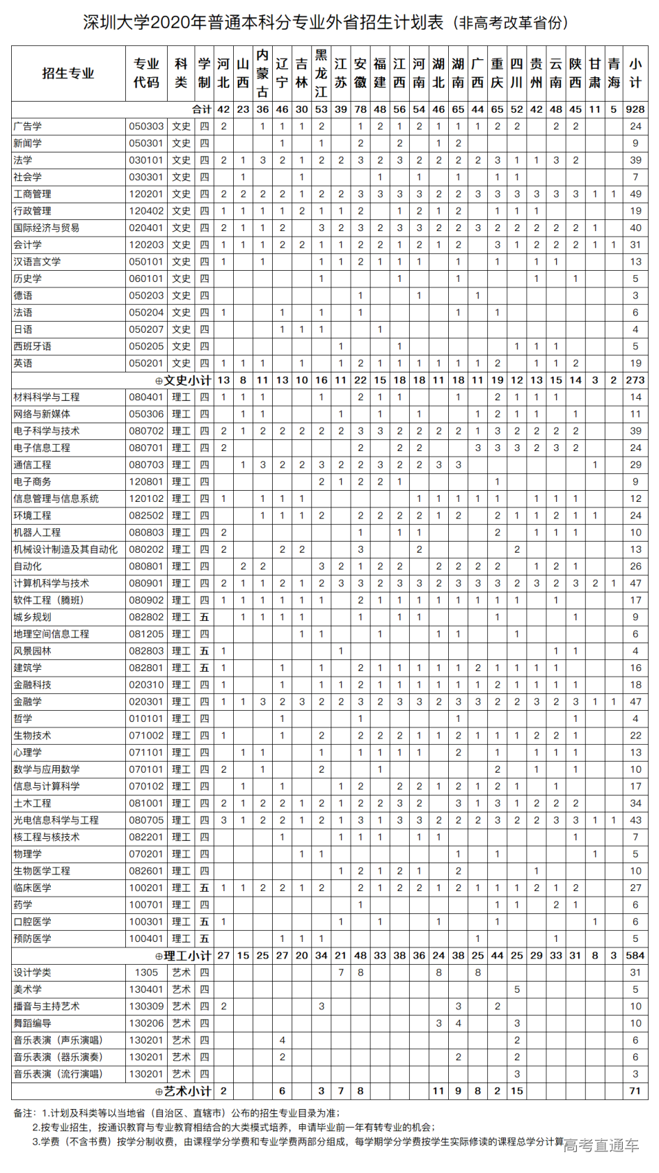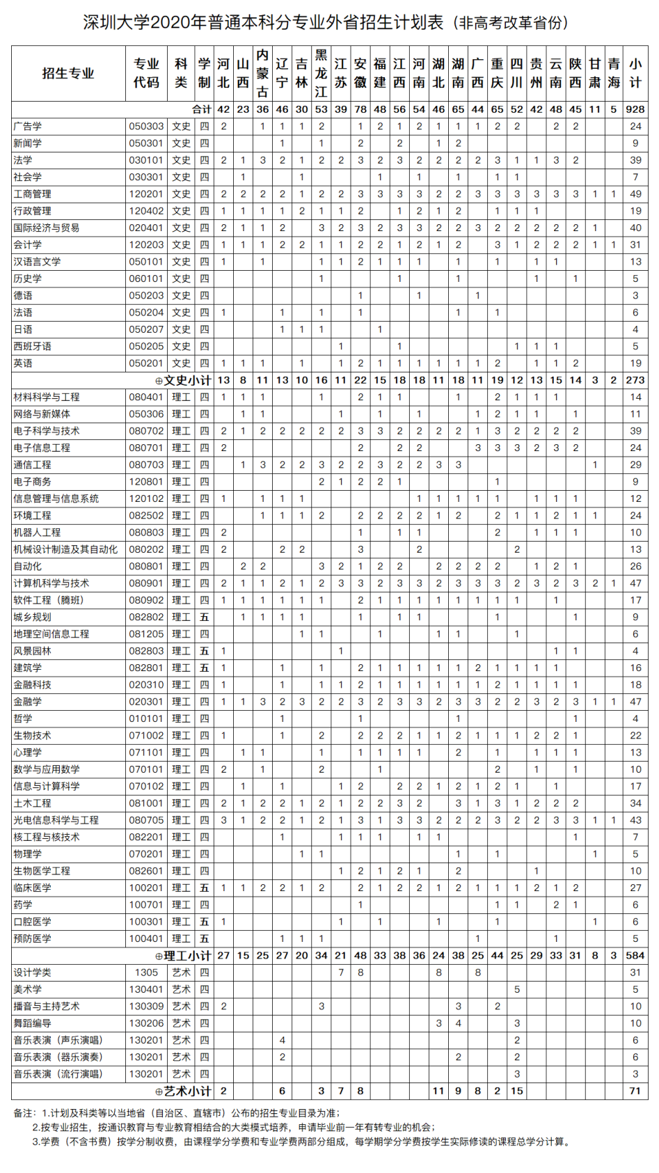 天津 2020年天津首年招生计划表: 1 安徽 历年安徽录取分数线统计: 按科类统计(按投档分统计) 按专业统计(按投档分统计) 2020年安徽招生计划表: 2 北京 历年北京录取分数线统计: 按科类统计(按投档分统计) 按专业统计(按投档分统计) 2020年北京招生计划表: 3 重庆 历年重庆录取分数线统计: 按科类统计(按投档分统计) 按专业统计(按投档分统计) 2020年重庆招生计划表: 4 福建 历年福建录取分数线统计: 按科类统计(按投档分统计) 按专业统计(按投档分统计) 2020年福建招生计划表: 5 甘肃 历年甘肃录取分数线统计: 按科类统计(按投档分统计) 按专业统计(按投档分统计) 2020年甘肃招生计划表: 6 广西 历年广西录取分数线统计: 按科类统计(按投档分统计) 按专业统计(按投档分统计) 2020年广西招生计划表: 7 贵州 历年贵州录取分数线统计: 按科类统计(按投档分统计) 按专业统计(按投档分统计) 2020年贵州招生计划表: 8 海南 历年海南录取分数线统计: 按科类统计(按投档分统计) 按专业统计(按投档分统计) 2020年海南招生计划表: 9 河北 历年河北录取分数线统计: 按科类统计(按投档分统计) 按专业统计(按投档分统计) 2020年河北招生计划表: 10 黑龙江 历年黑龙江录取分数线统计: 按科类统计(按投档分统计) 按专业统计(按投档分统计) 2020年黑龙江招生计划表: 11 河南 历年河南录取分数线统计: 按科类统计(按投档分统计) 按专业统计(按投档分统计) 2020年河南招生计划表: 12 湖北 历年湖北录取分数线统计: 按科类统计(按投档分统计) 按专业统计(按投档分统计) 2020年湖北招生计划表: 13 湖南 历年湖南录取分数线统计: 按科类统计(按投档分统计) 按专业统计(按投档分统计) 2020年湖南招生计划表: 14 江苏 历年江苏录取分数线统计: 按科类统计(按投档分统计) 按专业统计(按投档分统计) 2020年江苏招生计划表: 15 江西 历年江西录取分数线统计: 按科类统计(按投档分统计) 按专业统计(按投档分统计) 2020年江西招生计划表: 16 吉林 历年吉林录取分数线统计: 按科类统计(按投档分统计) 按专业统计(按投档分统计) 2020年吉林招生计划表: 17 辽宁 历年辽宁录取分数线统计: 按科类统计(按投档分统计) 按专业统计(按投档分统计) 2020年辽宁招生计划表: 18 内蒙古 历年内蒙古录取分数线统计: 按科类统计(按投档分统计) 按专业统计(按投档分统计) 2020年内蒙古招生计划表: 19 青海 历年青海录取分数线统计: 按科类统计(按投档分统计) 按专业统计(按投档分统计) 2020年青海招生计划表: 20 陕西 历年陕西录取分数线统计: 按科类统计(按投档分统计) 按专业统计(按投档分统计) 2020年陕西招生计划表: 21 山东 历年山东录取分数线统计: 按科类统计(按投档分统计) 按专业统计(按投档分统计) 2020年山东招生计划表: 22 上海 历年上海录取分数线统计: 按科类统计(按投档分统计) 按专业统计(按投档分统计) 2020年上海招生计划表: 23 山西 历年山西录取分数线统计: 按科类统计(按投档分统计) 按专业统计(按投档分统计) 2020年山西招生计划表: 24 四川 历年四川录取分数线统计: 按科类统计(按投档分统计) 按专业统计(按投档分统计) 2020年四川招生计划表: 25 云南 历年云南录取分数线统计: 按科类统计(按投档分统计) 按专业统计(按投档分统计) 2020年云南招生计划表: 26 浙江 历年浙江录取分数线统计: 按科类统计(按投档分统计) 按专业统计(按投档分统计) 2020年浙江招生计划表: 27 新疆 历年新疆录取分数线统计: 按科类统计(按投档分统计) 按专业统计(按投档分统计) 2020年新疆招生计划表: 深圳大学2020年普通本科 分专业外省招生计划总表 非高考改革省份: 高考改革省份: 备注: 1.计划及科类等以当地省(自治区、直辖市)公布的招生专业目录为准; 2.浙江、上海、北京、天津、山东、海南不分文理; 3.按专业招生,按通识教育与专业教育相结合的大类模式培养,申请毕业前一年有转专业的机会; 4.学费(不含书费)按学分制收费,由课程学分学费和专业学费两部分组成,每学期学分学费按学生实际修读的课程总学分计算。