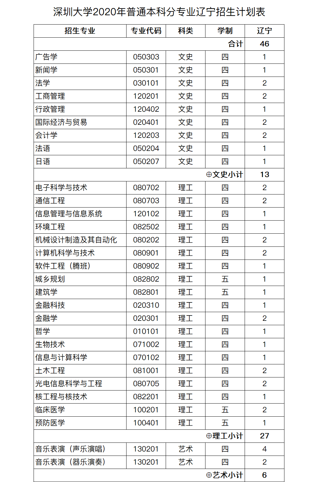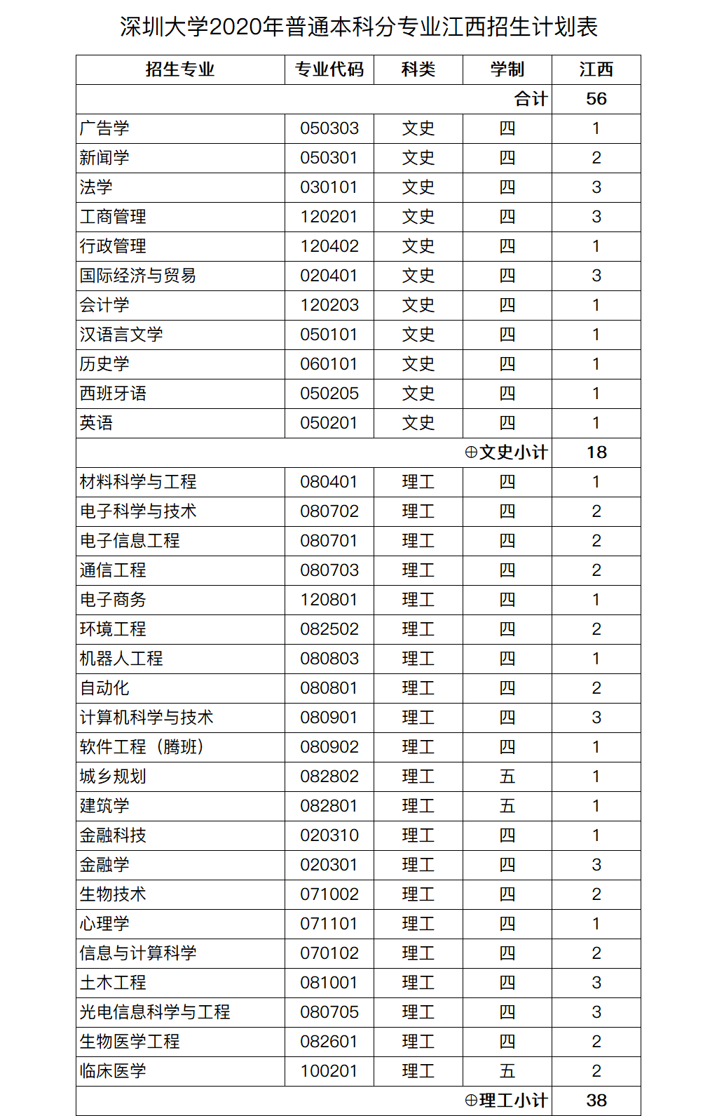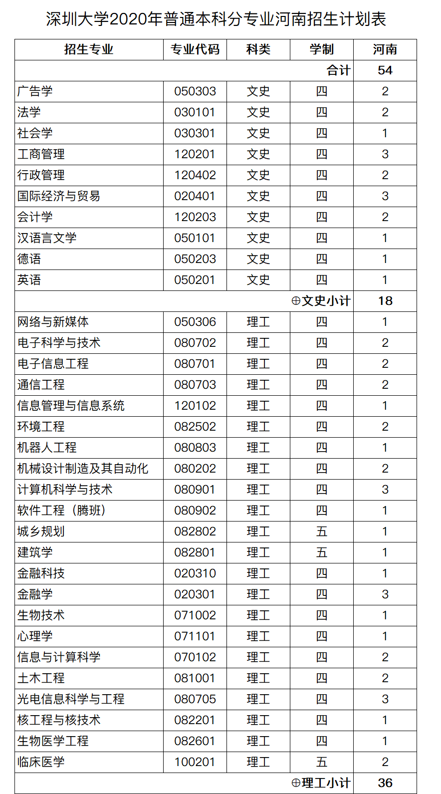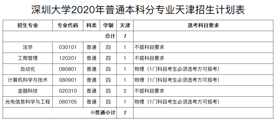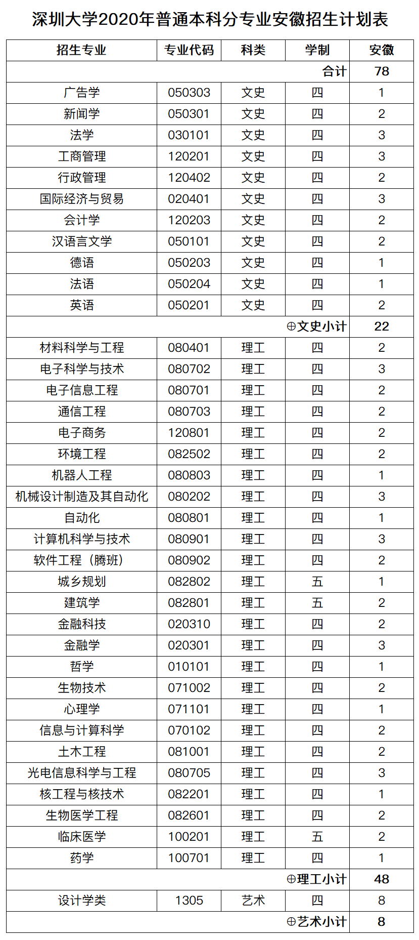 天津 2020年天津首年招生计划表: 1 安徽 历年安徽录取分数线统计: 按科类统计(按投档分统计) 按专业统计(按投档分统计) 2020年安徽招生计划表: 2 北京 历年北京录取分数线统计: 按科类统计(按投档分统计) 按专业统计(按投档分统计) 2020年北京招生计划表: 3 重庆 历年重庆录取分数线统计: 按科类统计(按投档分统计) 按专业统计(按投档分统计) 2020年重庆招生计划表: 4 福建 历年福建录取分数线统计: 按科类统计(按投档分统计) 按专业统计(按投档分统计) 2020年福建招生计划表: 5 甘肃 历年甘肃录取分数线统计: 按科类统计(按投档分统计) 按专业统计(按投档分统计) 2020年甘肃招生计划表: 6 广西 历年广西录取分数线统计: 按科类统计(按投档分统计) 按专业统计(按投档分统计) 2020年广西招生计划表: 7 贵州 历年贵州录取分数线统计: 按科类统计(按投档分统计) 按专业统计(按投档分统计) 2020年贵州招生计划表: 8 海南 历年海南录取分数线统计: 按科类统计(按投档分统计) 按专业统计(按投档分统计) 2020年海南招生计划表: 9 河北 历年河北录取分数线统计: 按科类统计(按投档分统计) 按专业统计(按投档分统计) 2020年河北招生计划表: 10 黑龙江 历年黑龙江录取分数线统计: 按科类统计(按投档分统计) 按专业统计(按投档分统计) 2020年黑龙江招生计划表: 11 河南 历年河南录取分数线统计: 按科类统计(按投档分统计) 按专业统计(按投档分统计) 2020年河南招生计划表: 12 湖北 历年湖北录取分数线统计: 按科类统计(按投档分统计) 按专业统计(按投档分统计) 2020年湖北招生计划表: 13 湖南 历年湖南录取分数线统计: 按科类统计(按投档分统计) 按专业统计(按投档分统计) 2020年湖南招生计划表: 14 江苏 历年江苏录取分数线统计: 按科类统计(按投档分统计) 按专业统计(按投档分统计) 2020年江苏招生计划表: 15 江西 历年江西录取分数线统计: 按科类统计(按投档分统计) 按专业统计(按投档分统计) 2020年江西招生计划表: 16 吉林 历年吉林录取分数线统计: 按科类统计(按投档分统计) 按专业统计(按投档分统计) 2020年吉林招生计划表: 17 辽宁 历年辽宁录取分数线统计: 按科类统计(按投档分统计) 按专业统计(按投档分统计) 2020年辽宁招生计划表: 18 内蒙古 历年内蒙古录取分数线统计: 按科类统计(按投档分统计) 按专业统计(按投档分统计) 2020年内蒙古招生计划表: 19 青海 历年青海录取分数线统计: 按科类统计(按投档分统计) 按专业统计(按投档分统计) 2020年青海招生计划表: 20 陕西 历年陕西录取分数线统计: 按科类统计(按投档分统计) 按专业统计(按投档分统计) 2020年陕西招生计划表: 21 山东 历年山东录取分数线统计: 按科类统计(按投档分统计) 按专业统计(按投档分统计) 2020年山东招生计划表: 22 上海 历年上海录取分数线统计: 按科类统计(按投档分统计) 按专业统计(按投档分统计) 2020年上海招生计划表: 23 山西 历年山西录取分数线统计: 按科类统计(按投档分统计) 按专业统计(按投档分统计) 2020年山西招生计划表: 24 四川 历年四川录取分数线统计: 按科类统计(按投档分统计) 按专业统计(按投档分统计) 2020年四川招生计划表: 25 云南 历年云南录取分数线统计: 按科类统计(按投档分统计) 按专业统计(按投档分统计) 2020年云南招生计划表: 26 浙江 历年浙江录取分数线统计: 按科类统计(按投档分统计) 按专业统计(按投档分统计) 2020年浙江招生计划表: 27 新疆 历年新疆录取分数线统计: 按科类统计(按投档分统计) 按专业统计(按投档分统计) 2020年新疆招生计划表: 深圳大学2020年普通本科 分专业外省招生计划总表 非高考改革省份: 高考改革省份: 备注: 1.计划及科类等以当地省(自治区、直辖市)公布的招生专业目录为准; 2.浙江、上海、北京、天津、山东、海南不分文理; 3.按专业招生,按通识教育与专业教育相结合的大类模式培养,申请毕业前一年有转专业的机会; 4.学费(不含书费)按学分制收费,由课程学分学费和专业学费两部分组成,每学期学分学费按学生实际修读的课程总学分计算。