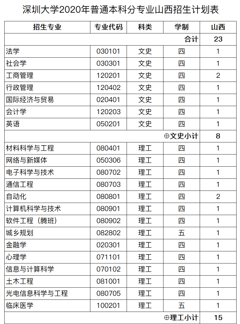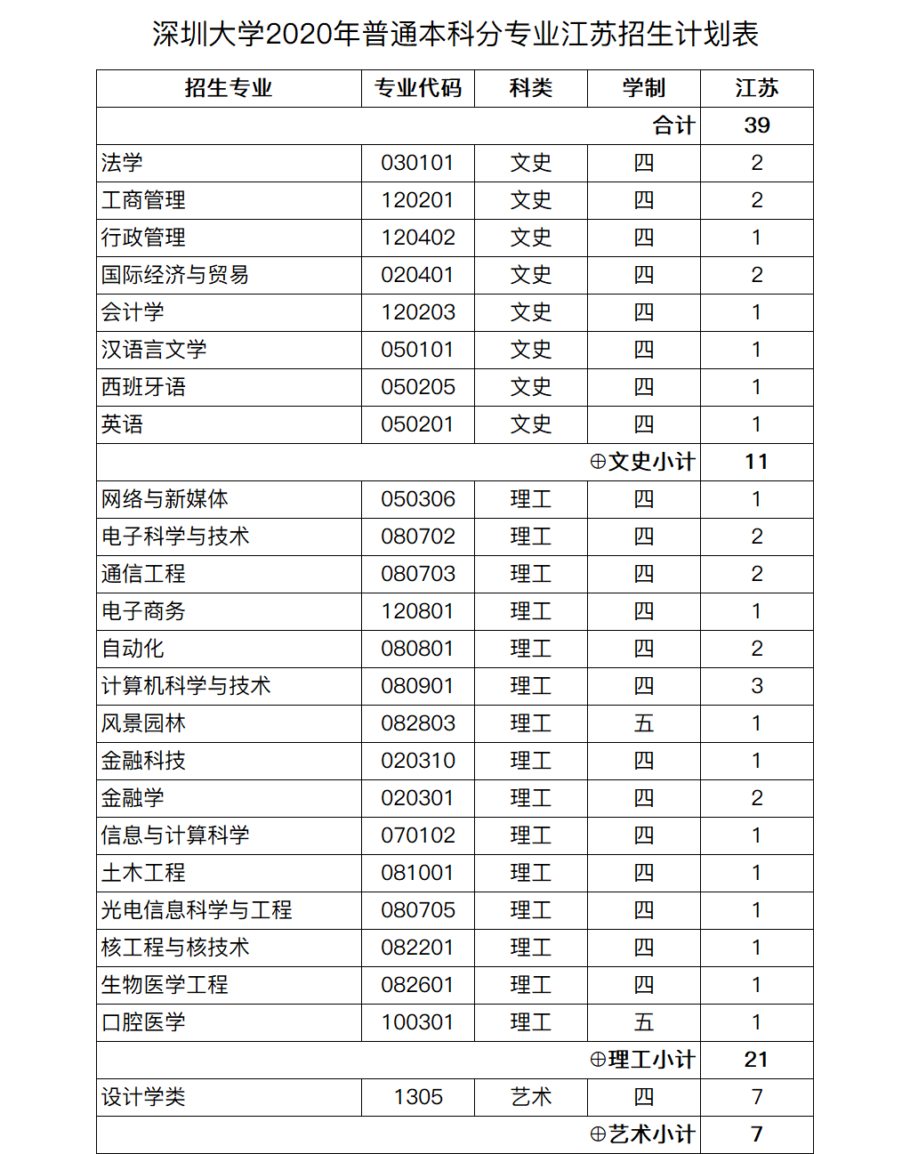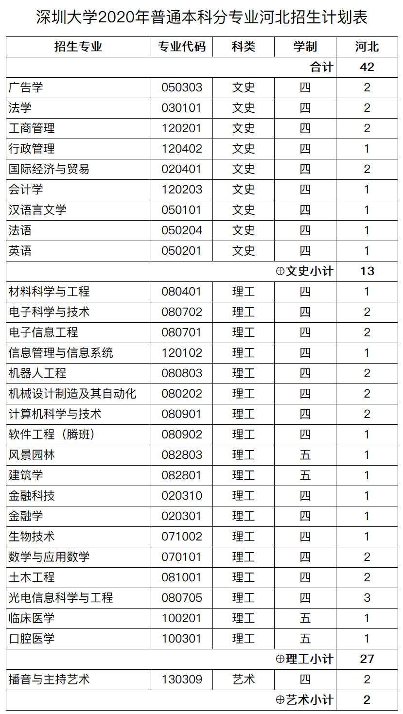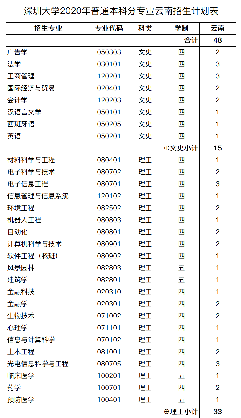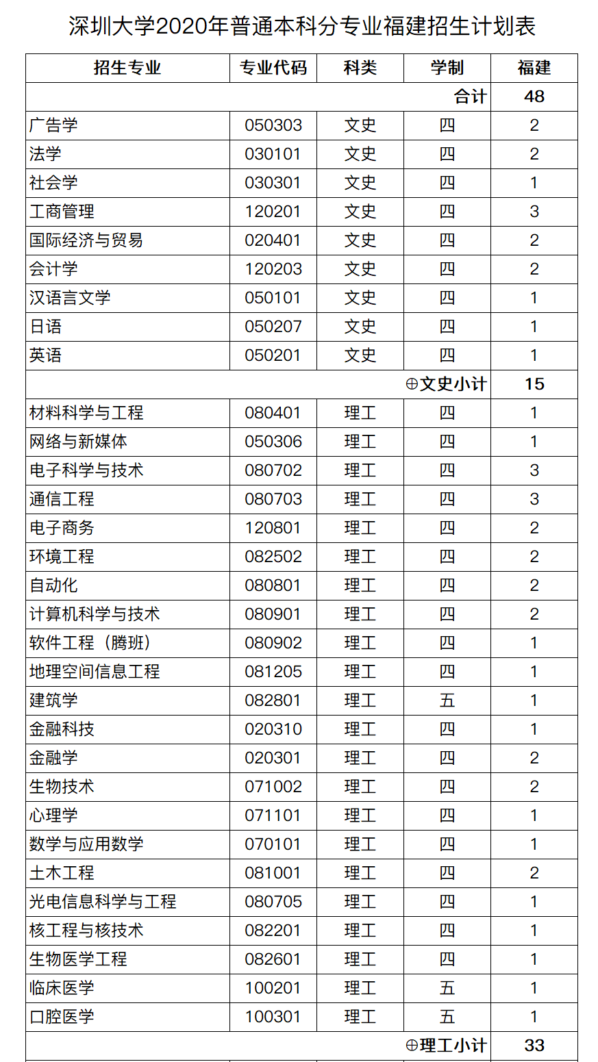 天津 2020年天津首年招生计划表: 1 安徽 历年安徽录取分数线统计: 按科类统计(按投档分统计) 按专业统计(按投档分统计) 2020年安徽招生计划表: 2 北京 历年北京录取分数线统计: 按科类统计(按投档分统计) 按专业统计(按投档分统计) 2020年北京招生计划表: 3 重庆 历年重庆录取分数线统计: 按科类统计(按投档分统计) 按专业统计(按投档分统计) 2020年重庆招生计划表: 4 福建 历年福建录取分数线统计: 按科类统计(按投档分统计) 按专业统计(按投档分统计) 2020年福建招生计划表: 5 甘肃 历年甘肃录取分数线统计: 按科类统计(按投档分统计) 按专业统计(按投档分统计) 2020年甘肃招生计划表: 6 广西 历年广西录取分数线统计: 按科类统计(按投档分统计) 按专业统计(按投档分统计) 2020年广西招生计划表: 7 贵州 历年贵州录取分数线统计: 按科类统计(按投档分统计) 按专业统计(按投档分统计) 2020年贵州招生计划表: 8 海南 历年海南录取分数线统计: 按科类统计(按投档分统计) 按专业统计(按投档分统计) 2020年海南招生计划表: 9 河北 历年河北录取分数线统计: 按科类统计(按投档分统计) 按专业统计(按投档分统计) 2020年河北招生计划表: 10 黑龙江 历年黑龙江录取分数线统计: 按科类统计(按投档分统计) 按专业统计(按投档分统计) 2020年黑龙江招生计划表: 11 河南 历年河南录取分数线统计: 按科类统计(按投档分统计) 按专业统计(按投档分统计) 2020年河南招生计划表: 12 湖北 历年湖北录取分数线统计: 按科类统计(按投档分统计) 按专业统计(按投档分统计) 2020年湖北招生计划表: 13 湖南 历年湖南录取分数线统计: 按科类统计(按投档分统计) 按专业统计(按投档分统计) 2020年湖南招生计划表: 14 江苏 历年江苏录取分数线统计: 按科类统计(按投档分统计) 按专业统计(按投档分统计) 2020年江苏招生计划表: 15 江西 历年江西录取分数线统计: 按科类统计(按投档分统计) 按专业统计(按投档分统计) 2020年江西招生计划表: 16 吉林 历年吉林录取分数线统计: 按科类统计(按投档分统计) 按专业统计(按投档分统计) 2020年吉林招生计划表: 17 辽宁 历年辽宁录取分数线统计: 按科类统计(按投档分统计) 按专业统计(按投档分统计) 2020年辽宁招生计划表: 18 内蒙古 历年内蒙古录取分数线统计: 按科类统计(按投档分统计) 按专业统计(按投档分统计) 2020年内蒙古招生计划表: 19 青海 历年青海录取分数线统计: 按科类统计(按投档分统计) 按专业统计(按投档分统计) 2020年青海招生计划表: 20 陕西 历年陕西录取分数线统计: 按科类统计(按投档分统计) 按专业统计(按投档分统计) 2020年陕西招生计划表: 21 山东 历年山东录取分数线统计: 按科类统计(按投档分统计) 按专业统计(按投档分统计) 2020年山东招生计划表: 22 上海 历年上海录取分数线统计: 按科类统计(按投档分统计) 按专业统计(按投档分统计) 2020年上海招生计划表: 23 山西 历年山西录取分数线统计: 按科类统计(按投档分统计) 按专业统计(按投档分统计) 2020年山西招生计划表: 24 四川 历年四川录取分数线统计: 按科类统计(按投档分统计) 按专业统计(按投档分统计) 2020年四川招生计划表: 25 云南 历年云南录取分数线统计: 按科类统计(按投档分统计) 按专业统计(按投档分统计) 2020年云南招生计划表: 26 浙江 历年浙江录取分数线统计: 按科类统计(按投档分统计) 按专业统计(按投档分统计) 2020年浙江招生计划表: 27 新疆 历年新疆录取分数线统计: 按科类统计(按投档分统计) 按专业统计(按投档分统计) 2020年新疆招生计划表: 深圳大学2020年普通本科 分专业外省招生计划总表 非高考改革省份: 高考改革省份: 备注: 1.计划及科类等以当地省(自治区、直辖市)公布的招生专业目录为准; 2.浙江、上海、北京、天津、山东、海南不分文理; 3.按专业招生,按通识教育与专业教育相结合的大类模式培养,申请毕业前一年有转专业的机会; 4.学费(不含书费)按学分制收费,由课程学分学费和专业学费两部分组成,每学期学分学费按学生实际修读的课程总学分计算。
