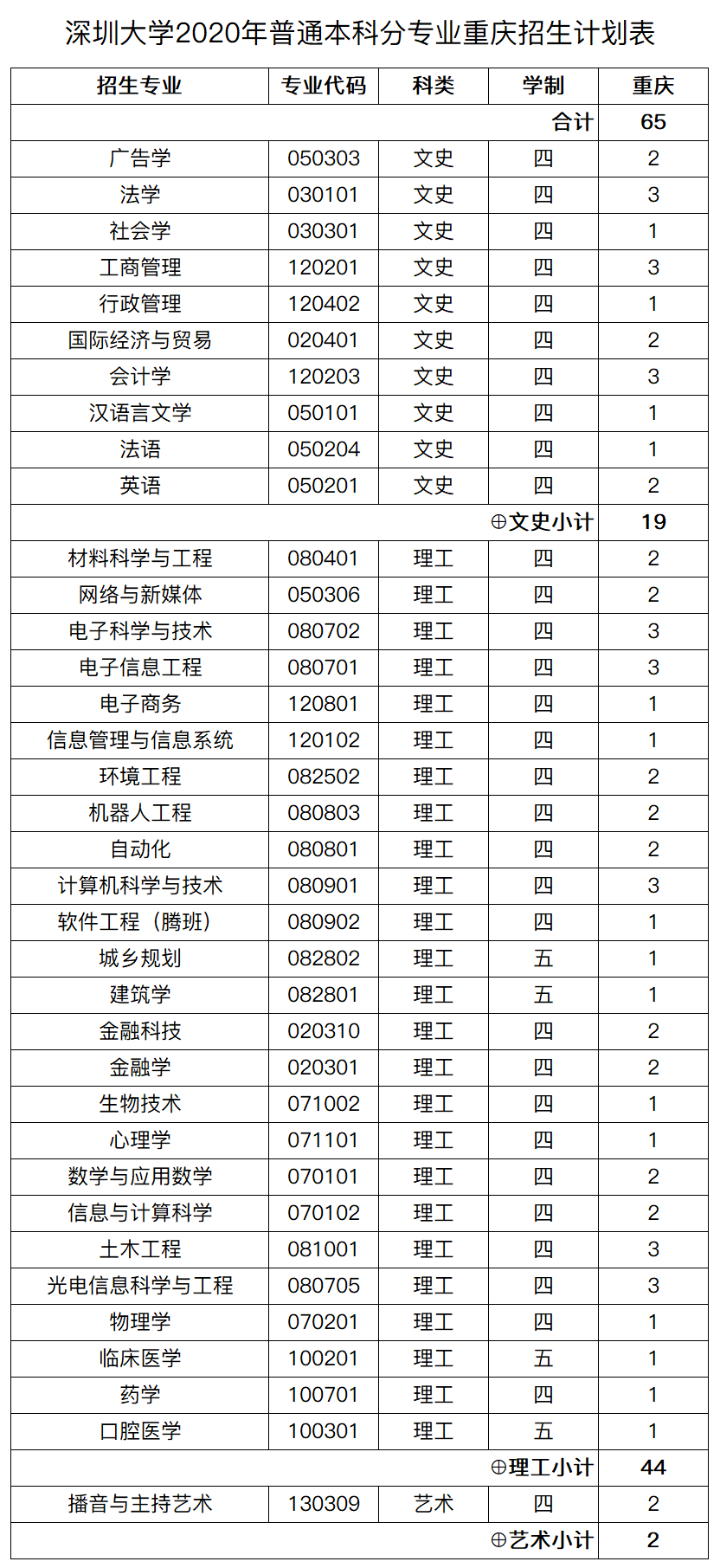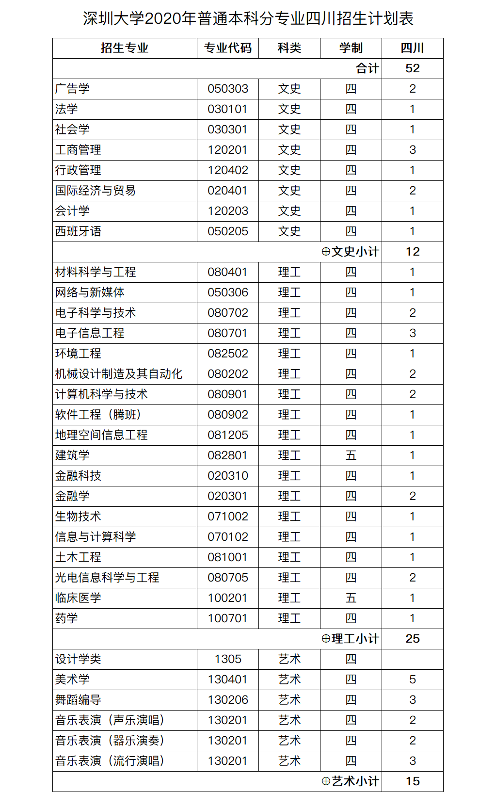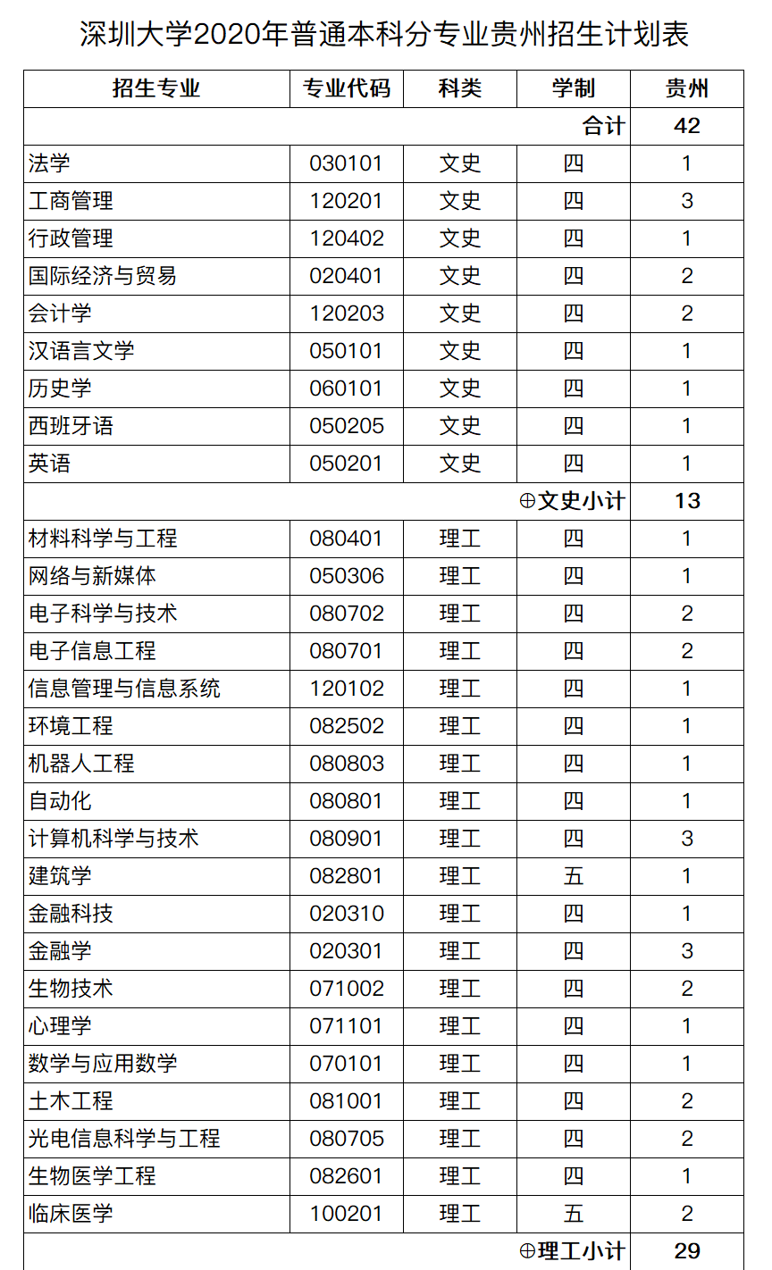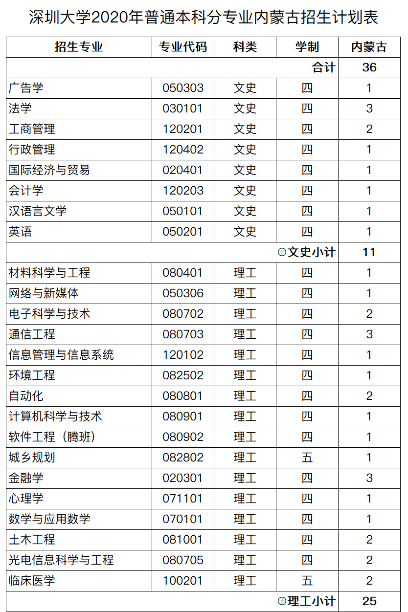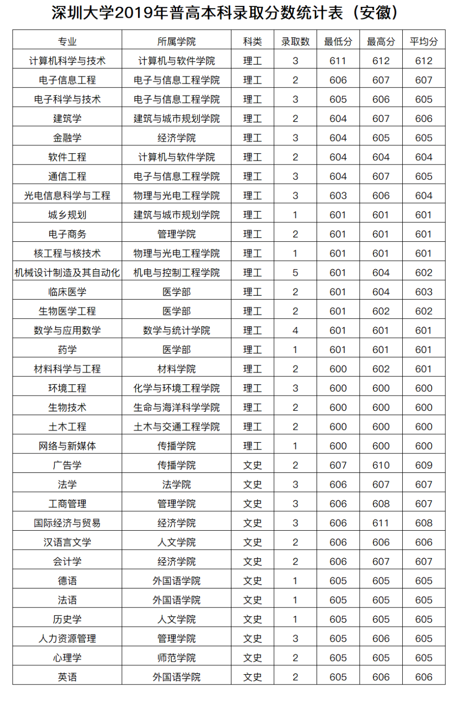 天津 2020年天津首年招生计划表: 1 安徽 历年安徽录取分数线统计: 按科类统计(按投档分统计) 按专业统计(按投档分统计) 2020年安徽招生计划表: 2 北京 历年北京录取分数线统计: 按科类统计(按投档分统计) 按专业统计(按投档分统计) 2020年北京招生计划表: 3 重庆 历年重庆录取分数线统计: 按科类统计(按投档分统计) 按专业统计(按投档分统计) 2020年重庆招生计划表: 4 福建 历年福建录取分数线统计: 按科类统计(按投档分统计) 按专业统计(按投档分统计) 2020年福建招生计划表: 5 甘肃 历年甘肃录取分数线统计: 按科类统计(按投档分统计) 按专业统计(按投档分统计) 2020年甘肃招生计划表: 6 广西 历年广西录取分数线统计: 按科类统计(按投档分统计) 按专业统计(按投档分统计) 2020年广西招生计划表: 7 贵州 历年贵州录取分数线统计: 按科类统计(按投档分统计) 按专业统计(按投档分统计) 2020年贵州招生计划表: 8 海南 历年海南录取分数线统计: 按科类统计(按投档分统计) 按专业统计(按投档分统计) 2020年海南招生计划表: 9 河北 历年河北录取分数线统计: 按科类统计(按投档分统计) 按专业统计(按投档分统计) 2020年河北招生计划表: 10 黑龙江 历年黑龙江录取分数线统计: 按科类统计(按投档分统计) 按专业统计(按投档分统计) 2020年黑龙江招生计划表: 11 河南 历年河南录取分数线统计: 按科类统计(按投档分统计) 按专业统计(按投档分统计) 2020年河南招生计划表: 12 湖北 历年湖北录取分数线统计: 按科类统计(按投档分统计) 按专业统计(按投档分统计) 2020年湖北招生计划表: 13 湖南 历年湖南录取分数线统计: 按科类统计(按投档分统计) 按专业统计(按投档分统计) 2020年湖南招生计划表: 14 江苏 历年江苏录取分数线统计: 按科类统计(按投档分统计) 按专业统计(按投档分统计) 2020年江苏招生计划表: 15 江西 历年江西录取分数线统计: 按科类统计(按投档分统计) 按专业统计(按投档分统计) 2020年江西招生计划表: 16 吉林 历年吉林录取分数线统计: 按科类统计(按投档分统计) 按专业统计(按投档分统计) 2020年吉林招生计划表: 17 辽宁 历年辽宁录取分数线统计: 按科类统计(按投档分统计) 按专业统计(按投档分统计) 2020年辽宁招生计划表: 18 内蒙古 历年内蒙古录取分数线统计: 按科类统计(按投档分统计) 按专业统计(按投档分统计) 2020年内蒙古招生计划表: 19 青海 历年青海录取分数线统计: 按科类统计(按投档分统计) 按专业统计(按投档分统计) 2020年青海招生计划表: 20 陕西 历年陕西录取分数线统计: 按科类统计(按投档分统计) 按专业统计(按投档分统计) 2020年陕西招生计划表: 21 山东 历年山东录取分数线统计: 按科类统计(按投档分统计) 按专业统计(按投档分统计) 2020年山东招生计划表: 22 上海 历年上海录取分数线统计: 按科类统计(按投档分统计) 按专业统计(按投档分统计) 2020年上海招生计划表: 23 山西 历年山西录取分数线统计: 按科类统计(按投档分统计) 按专业统计(按投档分统计) 2020年山西招生计划表: 24 四川 历年四川录取分数线统计: 按科类统计(按投档分统计) 按专业统计(按投档分统计) 2020年四川招生计划表: 25 云南 历年云南录取分数线统计: 按科类统计(按投档分统计) 按专业统计(按投档分统计) 2020年云南招生计划表: 26 浙江 历年浙江录取分数线统计: 按科类统计(按投档分统计) 按专业统计(按投档分统计) 2020年浙江招生计划表: 27 新疆 历年新疆录取分数线统计: 按科类统计(按投档分统计) 按专业统计(按投档分统计) 2020年新疆招生计划表: 深圳大学2020年普通本科 分专业外省招生计划总表 非高考改革省份: 高考改革省份: 备注: 1.计划及科类等以当地省(自治区、直辖市)公布的招生专业目录为准; 2.浙江、上海、北京、天津、山东、海南不分文理; 3.按专业招生,按通识教育与专业教育相结合的大类模式培养,申请毕业前一年有转专业的机会; 4.学费(不含书费)按学分制收费,由课程学分学费和专业学费两部分组成,每学期学分学费按学生实际修读的课程总学分计算。