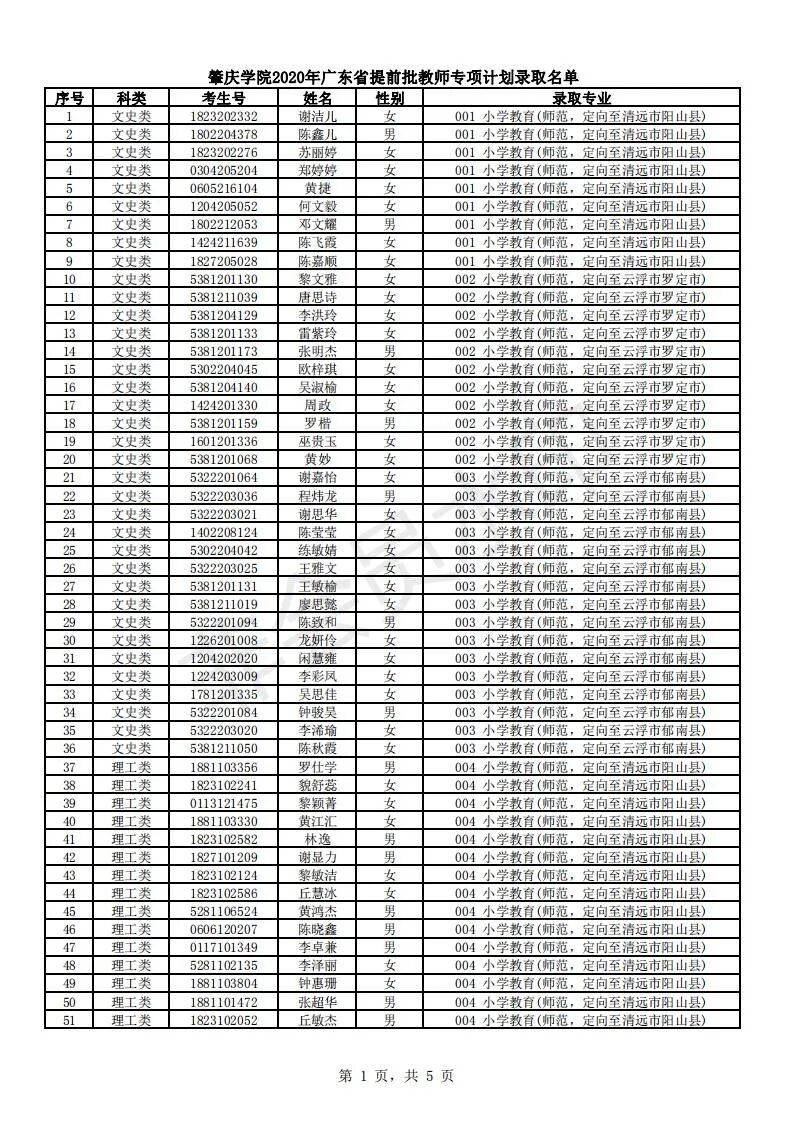经广东省教育考试院审核,我校录取小学教育(师范)专业100人,其中文史类36人,最高分547分,最高排位15167;理工类64人,最高分559分,最高排位47127;音乐学(师范)专业40人,最高分509分,最高排位883;美术学(师范)专业40人,最高分522分,最高排位2745;体育教育(师范)专业40人,最高分572分,最高排位196。肇庆学院2020年广东省普高提前批公费定向教师专项普通类录取情况
