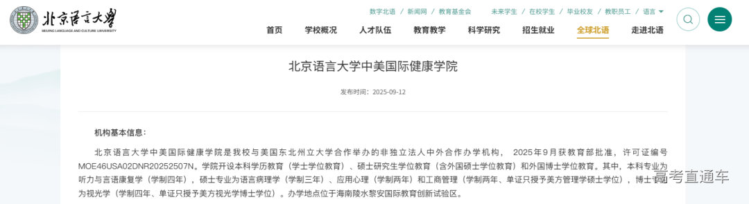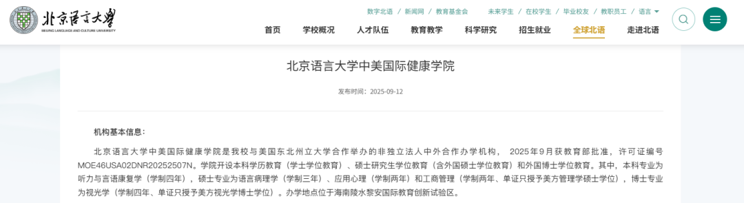今年9月,北京语言大学中美国际健康学院获教育部批准,该学院是北京语言大学与美国东北州立大学合作举办的非独立法人中外合作办学机构,开设本科学历教育(学士学位教育)、硕士研究生学位教育(含外国硕士学位教育)和外国博士学位教育。其中,本科专业为听力与言语康复学(学制四年),硕士专业为语言病理学(学制三年)、应用心理(学制两年)和工商管理(学制两年、单证只授予美方管理学硕士学位),博士专业为视光学(学制四年、单证只授予美方视光学博士学位)。办学地点位于海南陵水黎安国际教育创新试验区。