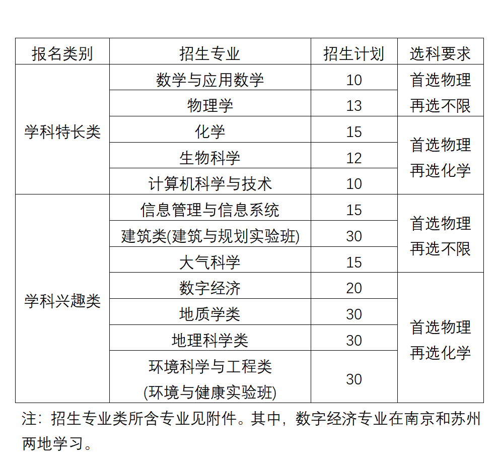 符合2023年普通高等学校招生全国统一考试报名条件,学业成绩名列前茅或基础学科拔尖的江苏省普通高中毕业生。考生选考科目应符合报考专业科目要求,身体条件还须符合《普通高等学校招生体检工作指导意见》要求及有关补充规定。报名考生分为以下两类: