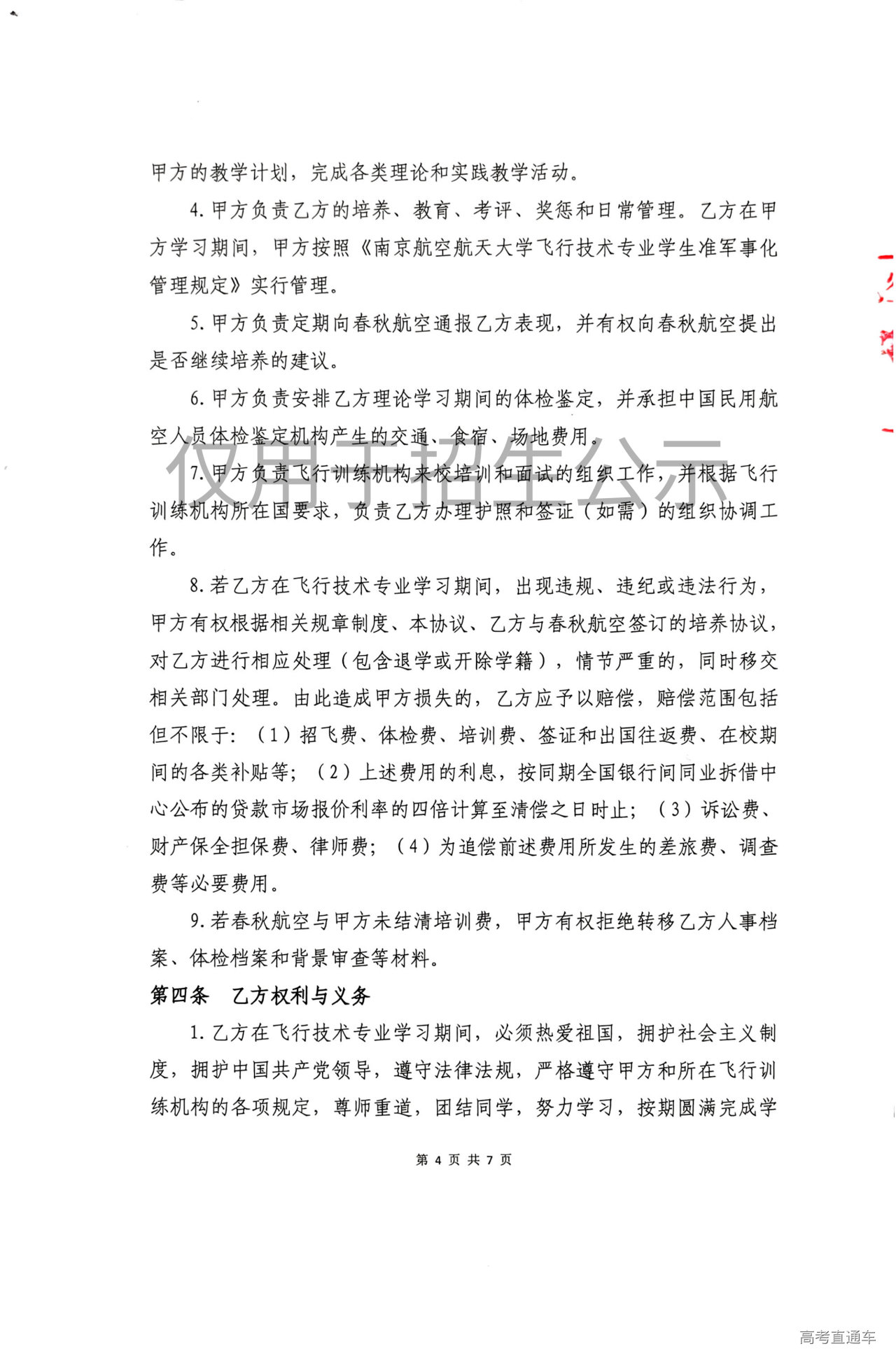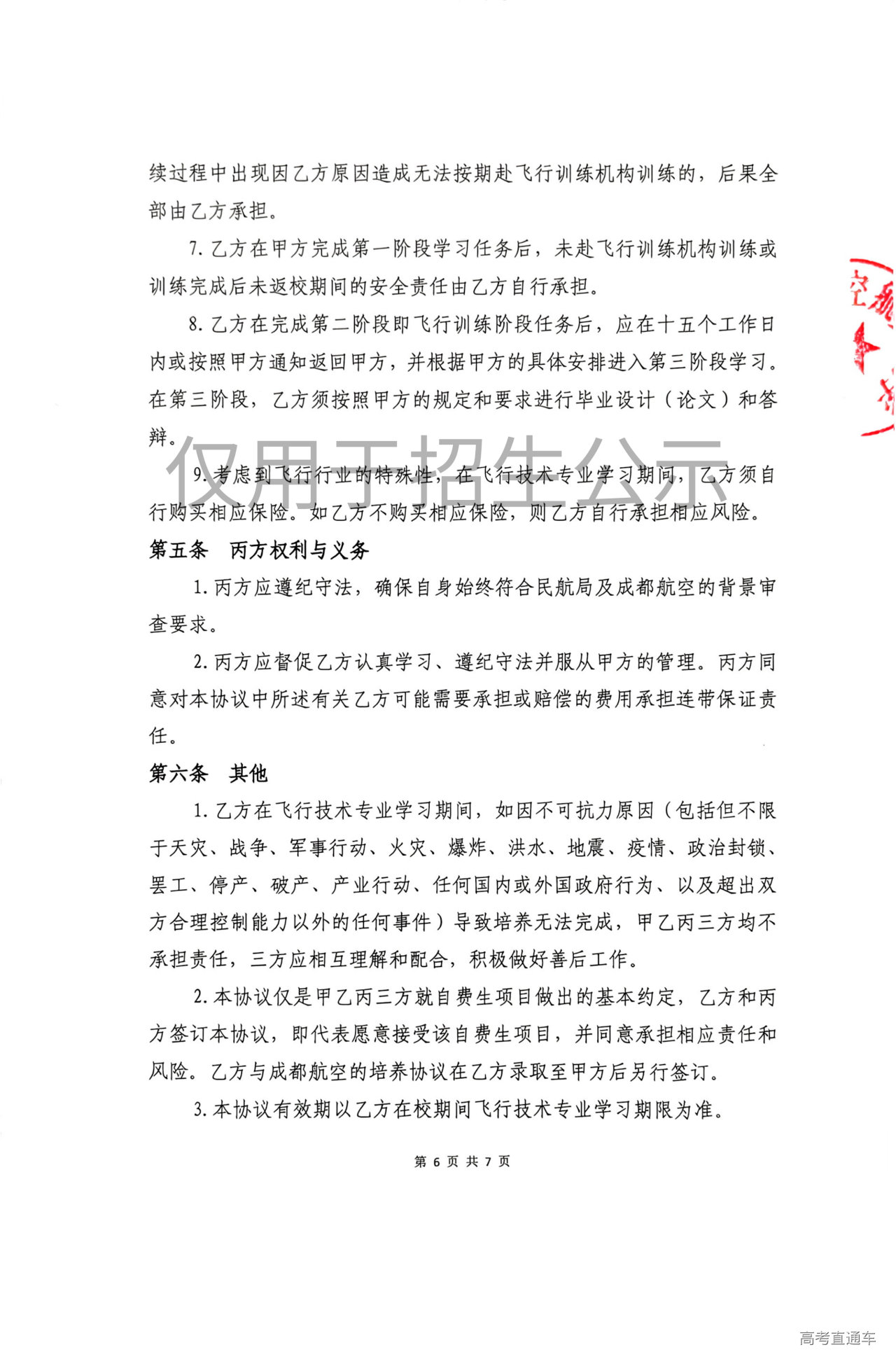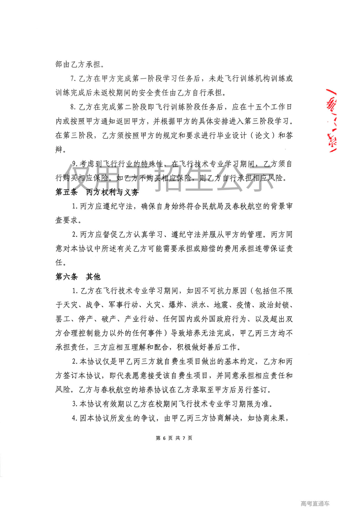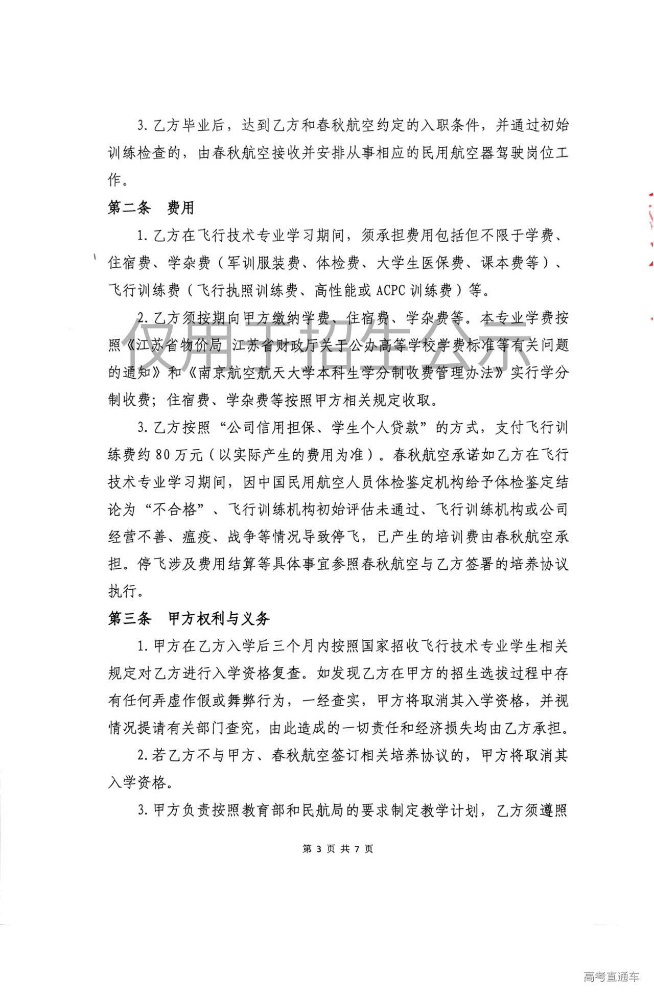 2.根据航空公司需求,我校计划在安徽、江西地区为春秋航空股份有限公司招收飞行技术专业学生,按照“公司信用担保、学生个人贷款”的方式,由学生负责飞行培训费用;计划在黑龙江地区为成都航空有限公司招收飞行技术专业学生,按照“公司垫资、学生分期偿还”的方式,由学生负责飞行培训费用。相关情况参照附件学生培养协议。航空公司承诺学生在飞行技术专业学习期间,如因中国民用航空人员体检鉴定机构给予体检鉴定结论为“不合格”、飞行训练机构初始评估未通过、飞行训练机构或公司经营不善、瘟疫、战争等情况导致停飞,已产生的培训费由航空公司承担。