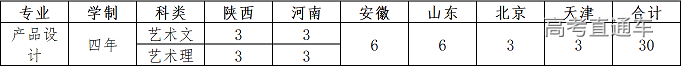 2020年我校艺术类“产品设计”专业面向陕西、河南、安徽、山东、北京、天津六省计划招生30名,具体分省计划以各省招生主管部门公布的招生计划为准。