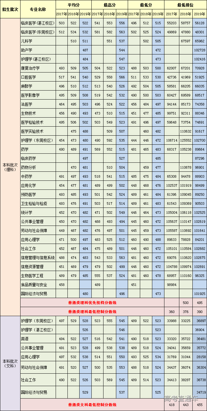 广东医科大学2017-2019年广东省各专业录取分数线