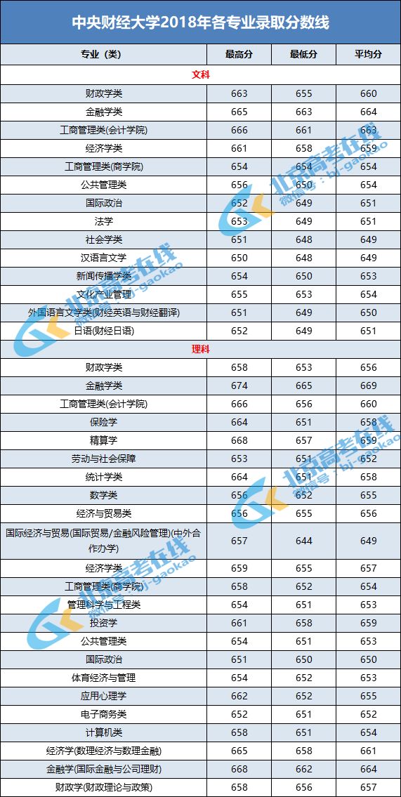 日前,中央财经大学公布了2018年各专业在京录取分数线!北京高考资讯整理,供参考!