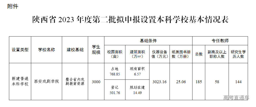 公示信息的附件中介绍,西安戏剧学院作为新建普通本科学校,建校基础为整合陕西省内戏剧教育资源,预计学生规模3000人,专任教师185人。