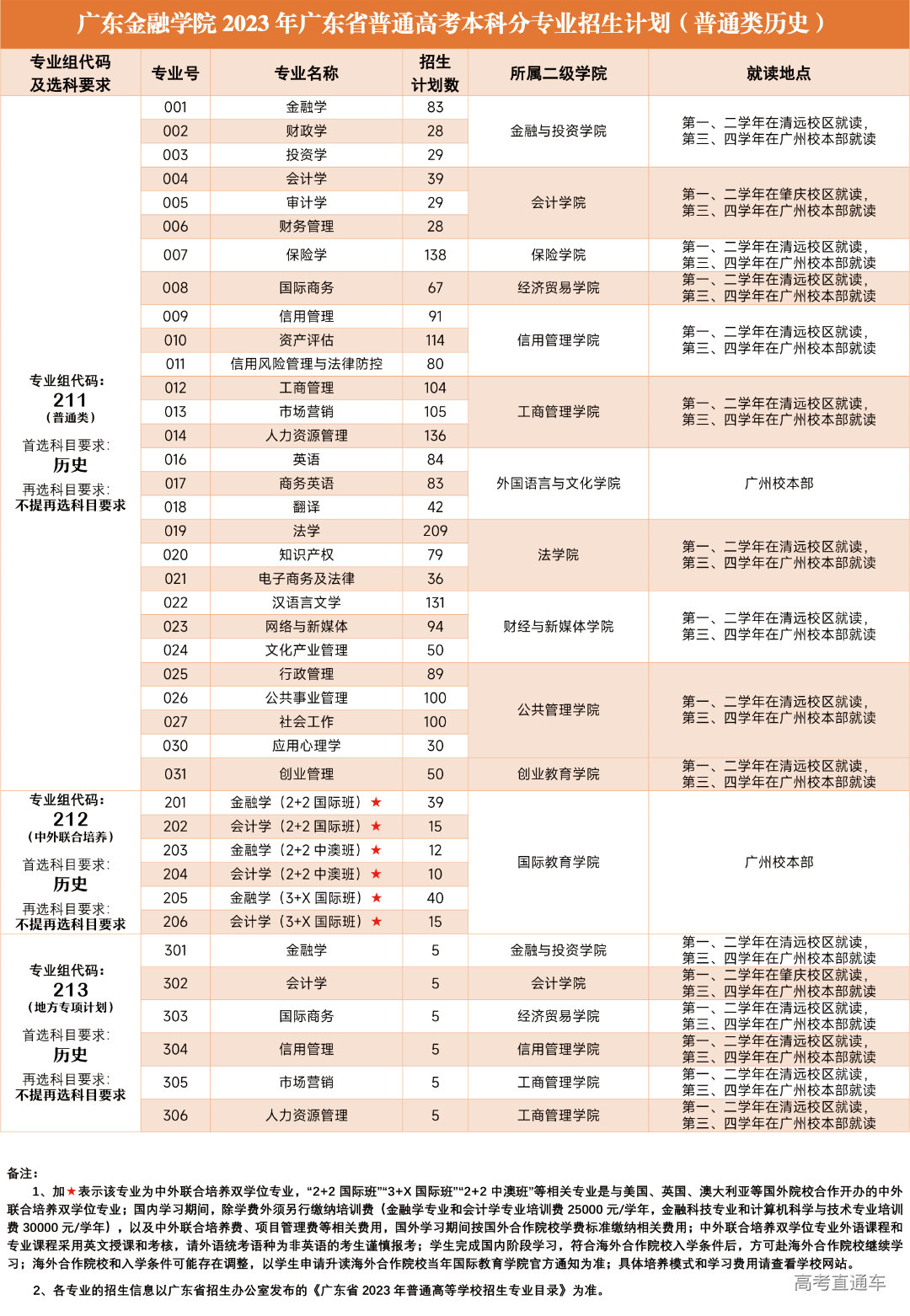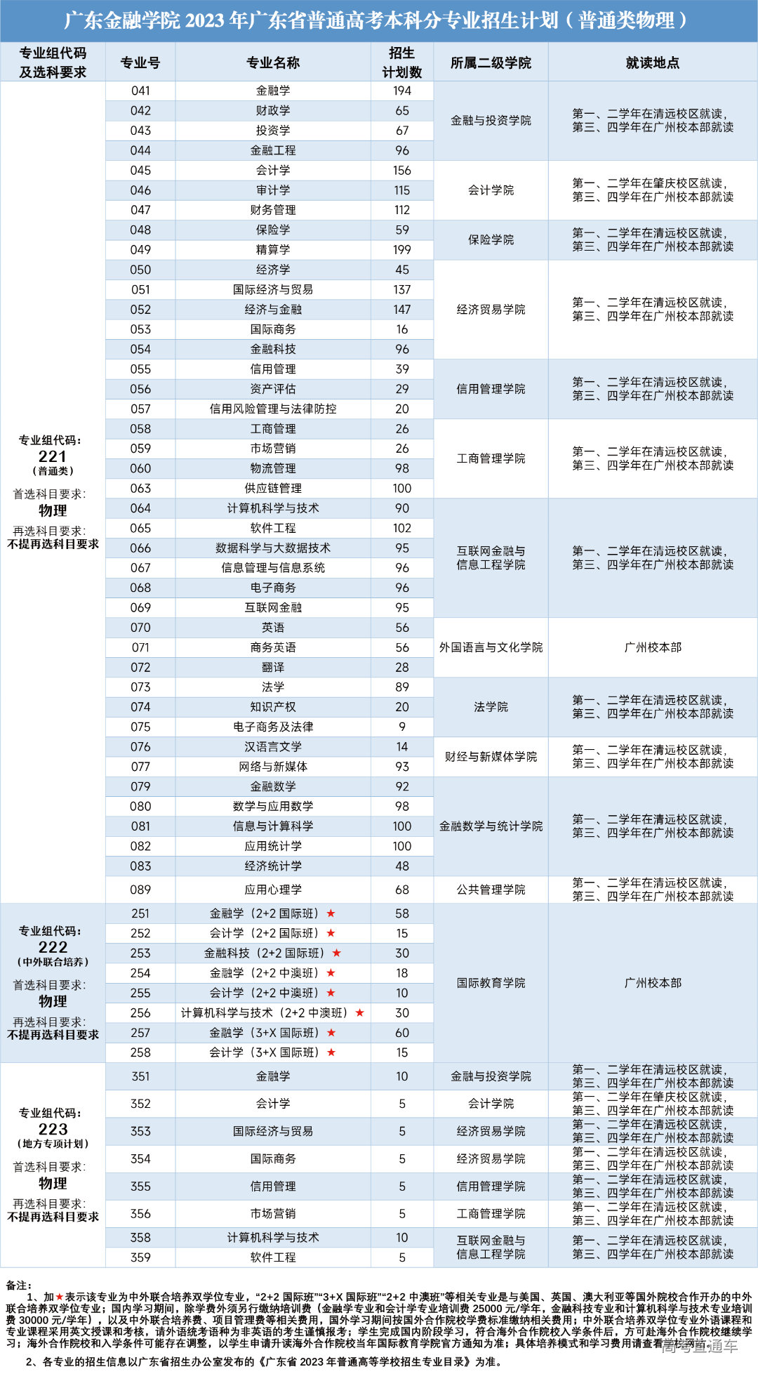 1、加 ★ 表示该专业为中外联合培养双学位专业,“2+2国际班”“3+X国际班”“2+2中澳班”等相关专业是与美国、英国、澳大利亚等国外院校合作开办的中外联合培养双学位专业;国内学习期间,除学费外须另行缴纳培训费(金融学专业和会计学专业培训费25000元/学年,金融科技专业和计算机科学与技术专业培训费30000元/学年),以及中外联合培养费、项目管理费等相关费用,国外学习期间按国外合作院校学费标准缴纳相关费用;中外联合培养双学位专业外语课程和专业课程采用英文授课和考核,请外语统考语种为非英语的考生谨慎报考;学生完成国内阶段学习,符合海外合作院校入学条件后,方可赴海外合作院校继续学习;海外合作院校和入学条件可能存在调整,以学生申请升读海外合作院校当年国际教育学院官方通知为准;具体培养模式和学习费用请查看学校网站。2、各专业的招生信息以广东省招生办公室发布的《广东省2023年普通高等学校招生专业目录》为准。