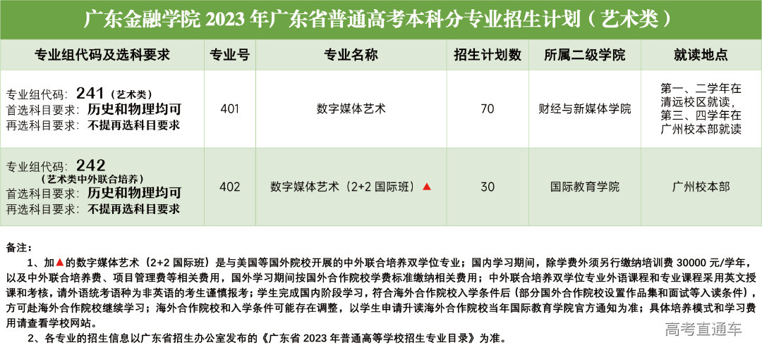 1、加▲的数字媒体艺术(2+2国际班)是与美国等国外院校开展的中外联合培养双学位专业;国内学习期间,除学费外须另行缴纳培训费30000元/学年,以及中外联合培养费、项目管理费等相关费用,国外学习期间按国外合作院校学费标准缴纳相关费用;中外联合培养双学位专业外语课程和专业课程采用英文授课和考核,请外语统考语种为非英语的考生谨慎报考;学生完成国内阶段学习,符合海外合作院校入学条件后(部分国外合作院校设置作品集和面试等入读条件),方可赴海外合作院校继续学习;海外合作院校和入学条件可能存在调整,以学生申请升读海外合作院校当年国际教育学院官方通知为准;具体培养模式和学习费用请查看学校网站。2、各专业的招生信息以广东省招生办公室发布的《广东省2023年普通高等学校招生专业目录》为准。