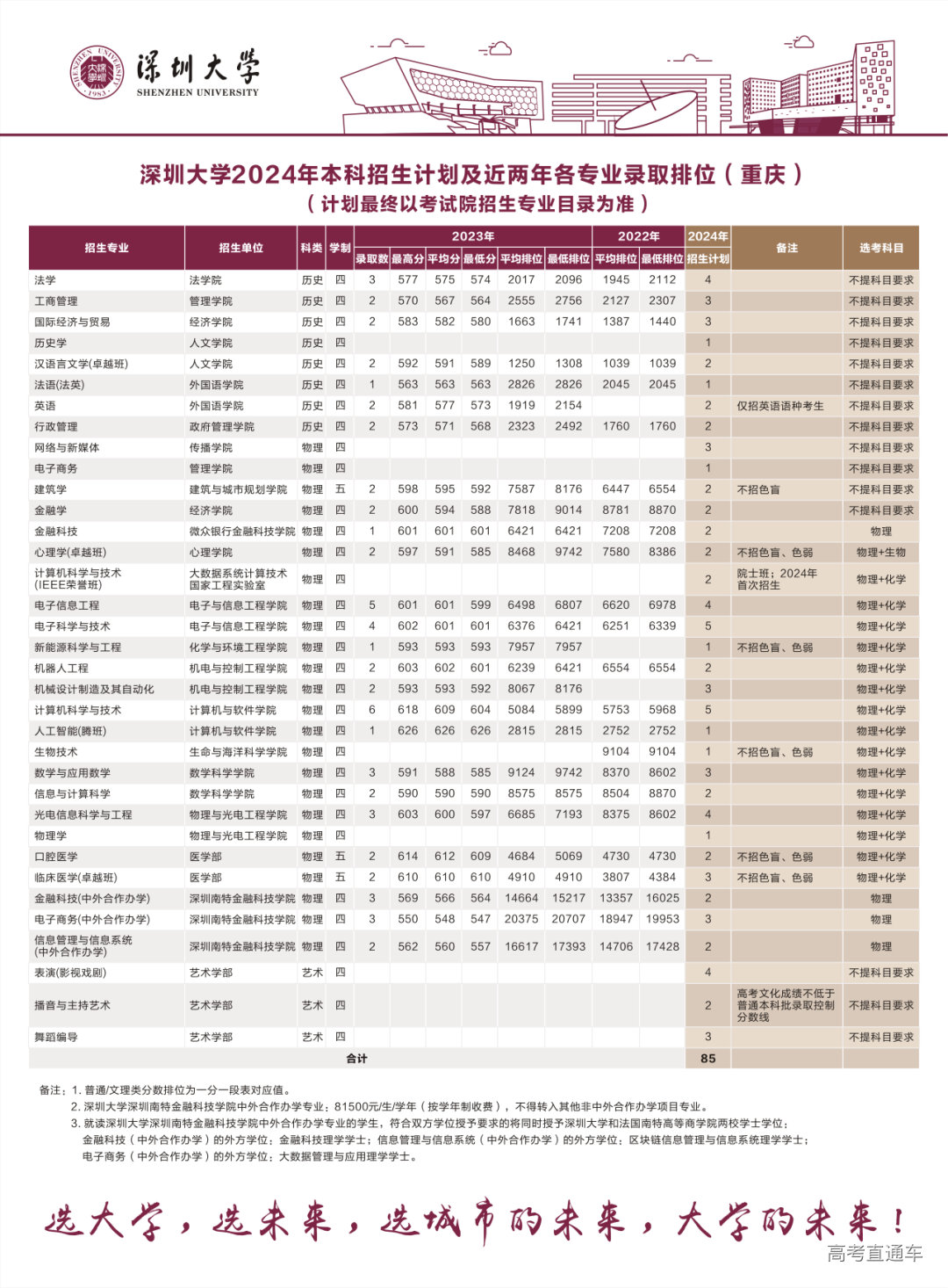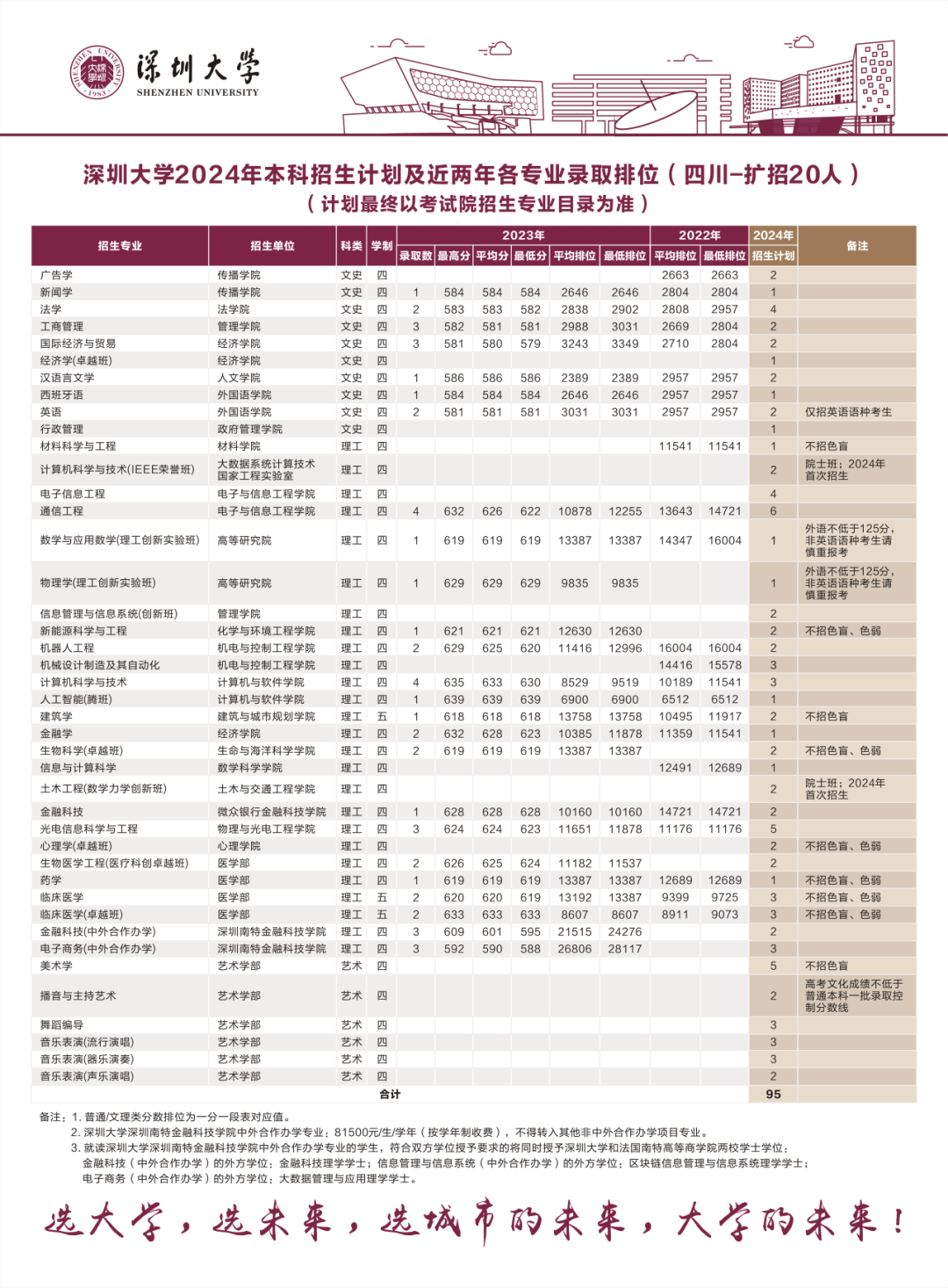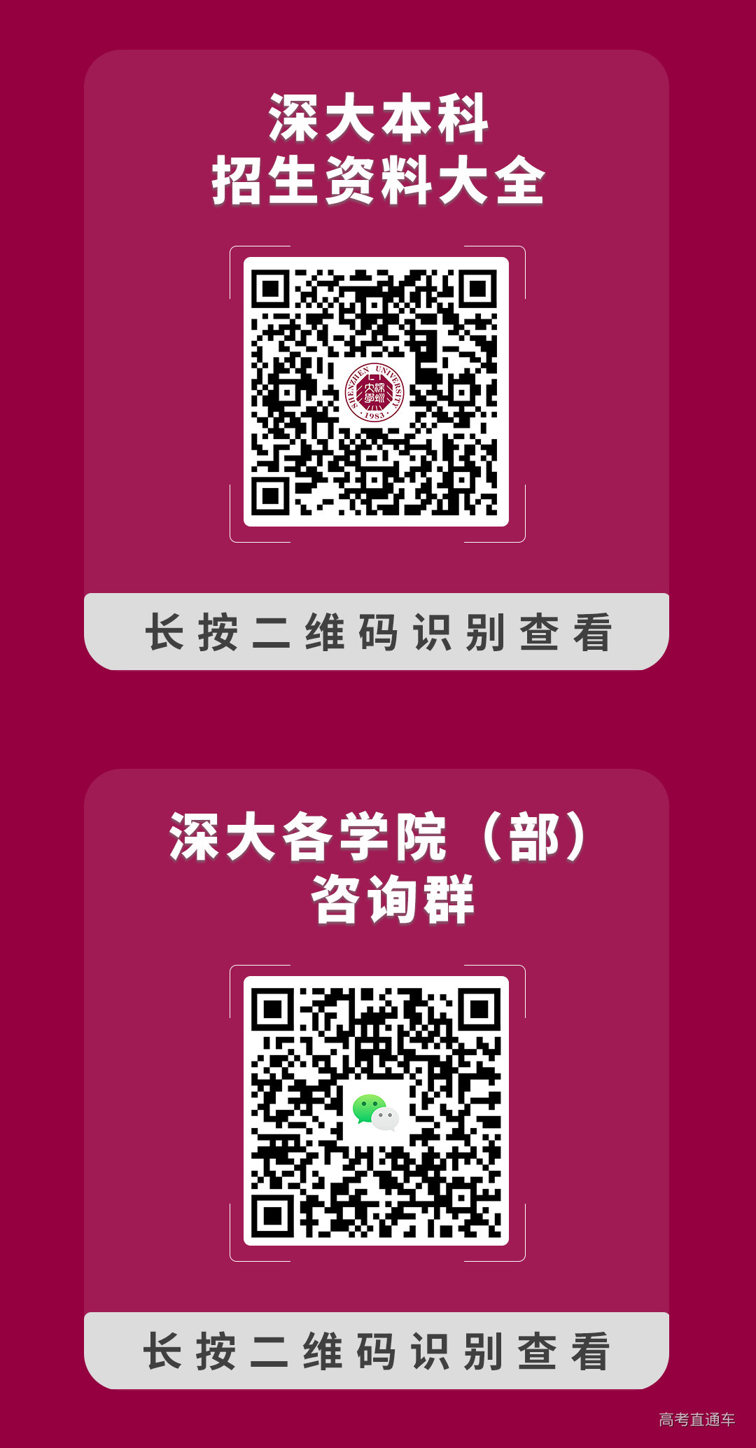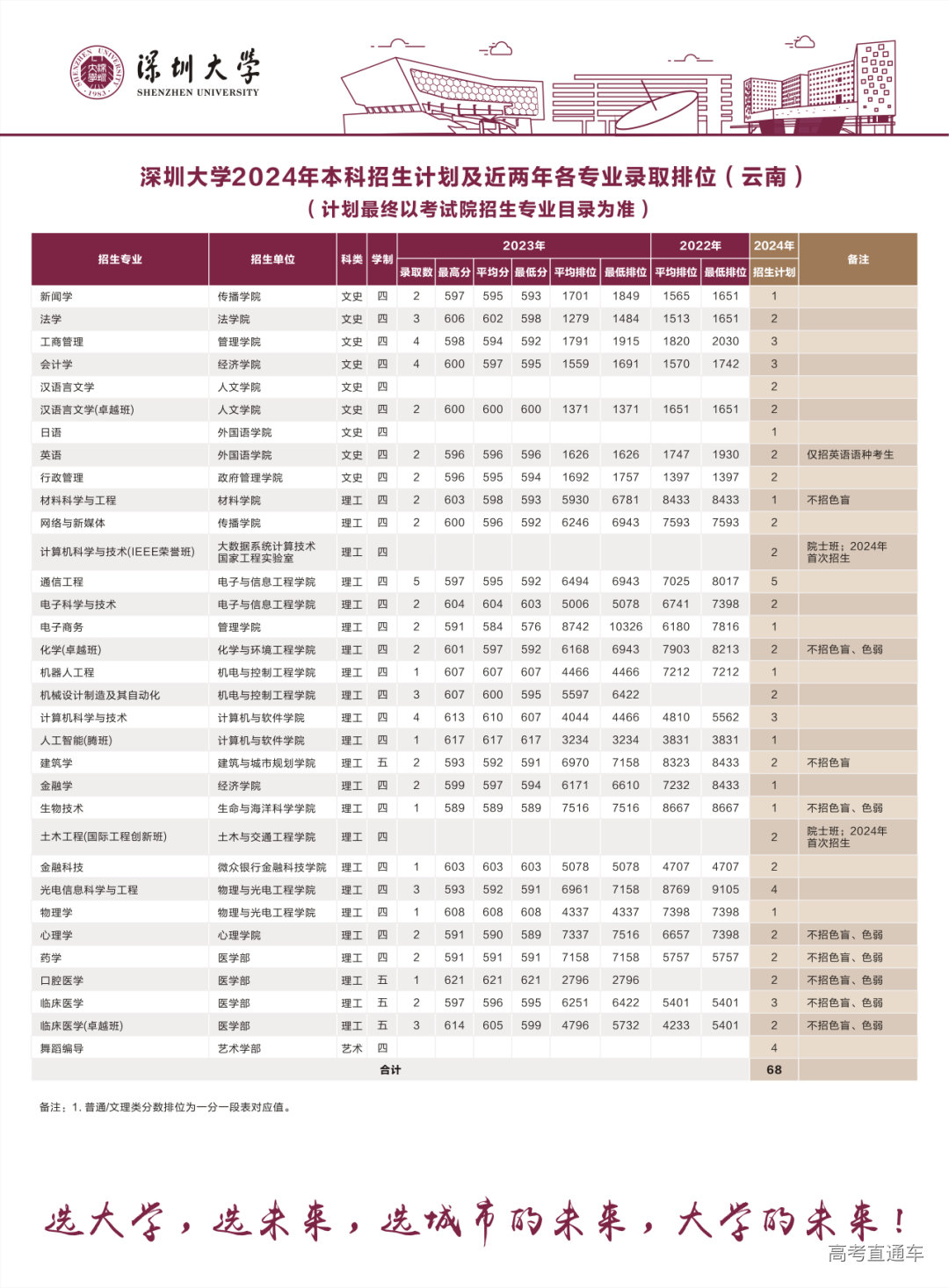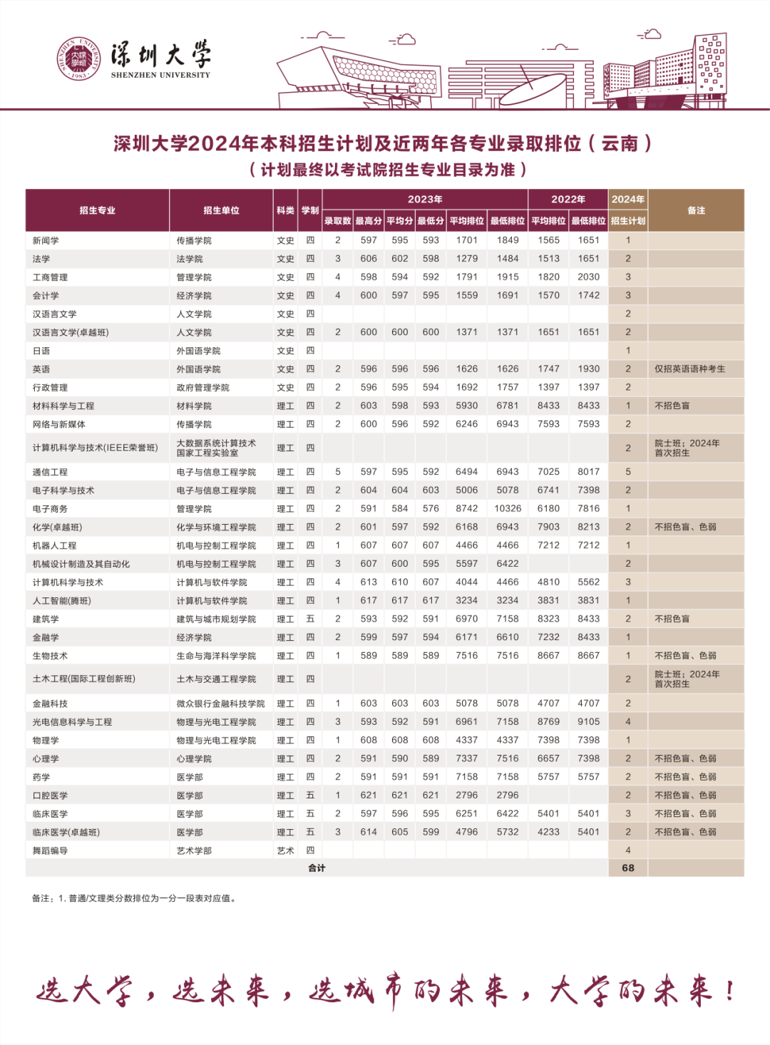备注 1. 招生计划相关信息,以省考试院最终公布为准; 2. 往年录取统计,建议参考排位;录取统计相关信息,以深圳大学本科招生网公布为准(点击文末“阅读原文”可达); 3. 深圳大学院校国标码为10590,各省市院校代号以招生专业目录和相关录取文件为准。