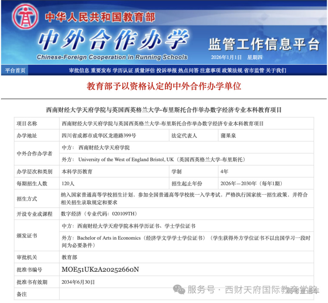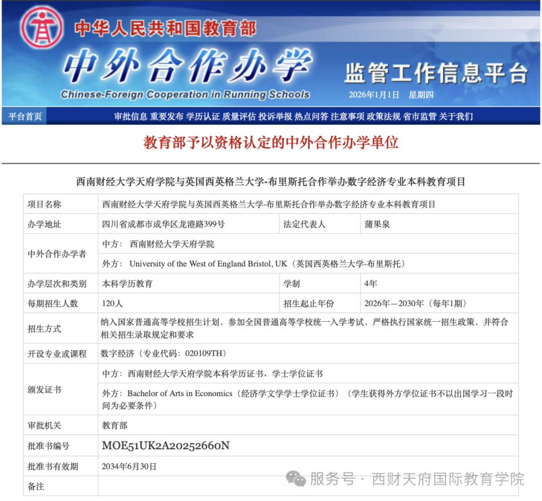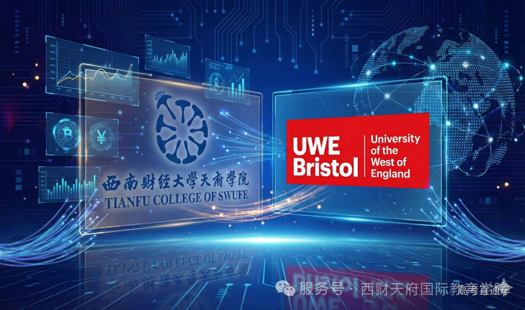 西南财经大学天府学院与英国西英格兰大学 合作举办 数字经济专业本科教育项目 在数字经济成为我国经济高质量发展核心引擎与“新质生产力”典型代表的宏观背景下,西南财经大学天府学院与英国西英格兰大学(UWE Bristol)合作举办数字经济专业本科教育项目获教育部正式批准(批准书编号:MOE51UK2A20252660N)。 该项目作为四川省首个聚焦“数字经济”领域的本科层次中外合作办学项目,不仅是我校对国家“数字中国”战略及成渝地区双城经济圈建设的积极响应,更是服务于四川作为国家数字经济创新发展试验区迫切人才需求的实际行动。从“十四五”数字经济发展规划开始,数据作为第五大生产要素的地位日益凸显,本项目的落地标志着学校国际化办学水平实现了从“单向输出”向“优质资源本土化”的质变,成为学校二十四年办学历程中的重要里程碑 。 作为本项目的英方合作伙伴,英国西英格兰大学(UWE Bristol)坐落于被誉为“欧洲硅谷”的布里斯托市,是英国规模最大、最受青睐的现代化大学之一 。该校在《卫报》大学指南2026中位列全英第39位,并凭借卓越的教学质量荣获英国政府教学卓越框架(TEF)的学生体验金奖。布里斯托作为英国领先的智慧城市,汇聚了空客、劳斯莱斯、惠普等全球科技巨头,为该校提供了得天独厚的产学研生态。 西南财经大学天府学院与西英格兰大学有着二十余年的深厚合作积淀,此次强强联手,旨在将英方在数字创意与科技产业集群中的前沿教育经验引入中国,共同打造具有国际竞争力的数字经济学科高地 。 项目在人才培养上展现了极高的战略眼光与硬核实力,致力于培养“懂经济的数据分析师”与“懂技术的商业决策者”。采用极具性价比与稳定性的“4+0”双学位模式,学生四年均在成都校区就读,毕业后同时获得中外两校本科文凭。 项目课程体系构建了从数理基础到数字技术的四阶递进模式,深度整合了英方先进的教学资源,包括全英领先的配备彭博(Bloomberg)终端的金融市场实验室、专注商业创新的大数据与人工智能实验室(Big-DEAL)以及全欧规模最大的布里斯托机器人实验室(BRL)的科研理念。这种“经济理论筑基、数字技术赋能”的培养方案,通过项目制学习(PBL)与沉浸式双语教学,确保学生不仅掌握Python、大数据、区块链等核心技术工具,更能深刻理解数字贸易规则与商业逻辑 。 展望未来,该项目将持续为国家战略与区域经济高质量发展注入强劲的“智力芯片”。随着成都市全力打造西部数字经济高地,区域内对兼具国际视野与本土实践能力的复合型高端人才需求呈井喷式增长。项目毕业生将精准对接金融科技产品经理、数据分析师、数字化转型顾问等岗位蓝海,成为推动四川经济从“要素驱动”向“创新驱动”转型的关键力量。 我校将以此为窗口,进一步构筑国际化人才高地,赋能新质生产力,培养出一批能够在全球数字文明时代驾驭算法与数据、创造真实商业价值的数字精英。