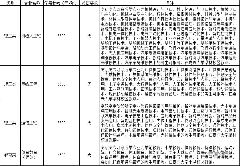 一、学校概况 学校全称和国标代码:嘉兴大学,10354。 办学层次和类型:本科及研究生,全日制公办普通高等学校。 颁发毕业证书及学位证书的学校名称:嘉兴大学。 二、招生专业 学校2025年免试专升本按专业对口原则实施招生,考生高职高专阶段所学专业须符合所报专业志愿的限报专业要求,招生专业信息见下表。最终分专业招生计划以浙江省教育考试院公布为准,最终学费标准以物价部门批准公布为准。 三、招生对象 符合下列条件的人员可以提出申请: 普通高校高职(专科)毕业生及在校生(含高校新生)在浙江省应征入伍,退役后完成高职(专科)学业。 遵守中华人民共和国宪法和法律。 身体健康,各专业身体健康要求按教育部等部门联合制定的《普通高等学校招生体检工作指导意见》执行。 四、报名与志愿填报 免试专升本招生的报名和志愿填报根据《浙江省2025年退役大学生士兵免试专升本招生工作实施办法》执行。 五、综合测试 体育教育(师范)专业综合测试形式采取体能测试和面试方式,其他专业综合测试形式采取笔试方式。具体综合测试公告,将发布在学校本科招生网站(https://zsb.zjxu.edu.cn/),请报名考生随时关注。 若浙江省教育考试院提供的当轮考生人数少于或等于对应招生类别和招生专业的当轮计划数,符合报考资格的考生均录取,不再组织当轮综合测试。 若浙江省教育考试院提供的当轮考生人数大于对应招生类别和招生专业的当轮计划数,学校根据浙江省教育考试院提供的当轮考生名单组织综合测试(荣立个人三等功以上且符合报考资格的考生除外)。未按要求参加综合测试的考生视为放弃申请报考资格,不能进入后续的录取环节。 六、录取规则 学校对在入伍期间荣立个人三等功及以上的考生优先录取。 学校依据当轮综合测试成绩,按照招生类别对考生进行排序。同一招生类别内的所有考生,遵循“分数优先,遵从志愿”的原则,按综合测试成绩从高分到低分依次录取,专业志愿之间不设分数级差。学校对所填专业志愿均不能满足的考生,作退档处理。未被我校录取的,进入后续志愿的投档程序。 当第一志愿录取未满时,学校将进行后续志愿录取,测试及录取形式类比第一志愿。学校录取进程及结果按照教育部和浙江省教育考试院的有关要求及规定形式进行公布。考生可在学校本科招生网站查询。 对非应届考生,我校将于4月底前公布正式录取结果。对预录取的应届毕业生,学校根据浙江省教育厅审核通过的高职(专科)毕业资格名单,办理录取手续,寄发录取通知书,不能如期毕业的取消录取资格。 七、其他 学校退役大学生士兵免试专升本招生录取工作中的重大问题由我校招生就业工作委员会讨论决定。 学校纪检监察室按照相关规定进行监督,确保招生录取工作公平、公正、公开。监督电话:0573-83642345。监督举报邮箱:jbyts@mail.zjxu.edu.cn。 新生入学后,学校将进行全面复查,对不符合报考条件、报到条件和录取标准以及弄虚作假、违纪舞弊者,取消其入学资格,并报省教育考试院备案。 学校外语公共课为英语。 如遇重大突发情况,学校将视情保留对相关考核内容、方式、时间地点等调整的权利。 本招生简章由嘉兴大学招生办公室负责解释,若有与国家和上级有关政策不一致之处,以国家和上级有关政策为准。 八、联系方式 联系部门:嘉兴大学招生办公室 地址:嘉兴市广穹路899号嘉兴大学梁林校区 联系电话:0573-83640000 传真:0573-83642036 QQ咨询:248810354 电子邮件:zjxuzb@zjxu.edu.cn 学校网址:https://www.zjxu.edu.cn 本科招生网址:https://zsb.zjxu.edu.cn 本科招生微信号:zjxuzs