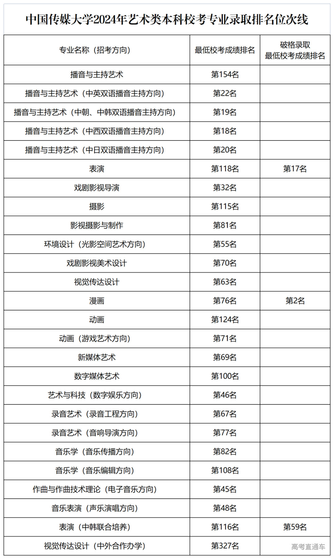 中国传媒大学2024年艺术类本科校考专业录取排名位次线