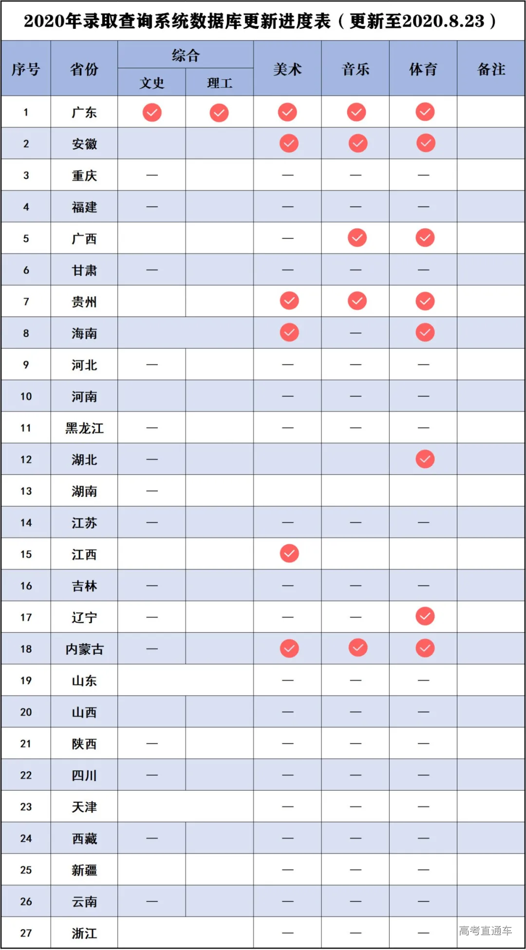 “✔”表示可以查询;“——”表示无此录取科类;空白表示还未更新数据库,暂不能查询。
