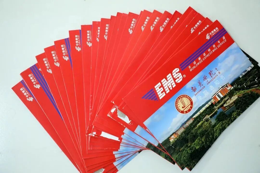 今年韶关学院的EMS信封采用了大红底色配校园景观与通知书封页的校园照片相呼应内页的校徽暗纹与沉稳配色端庄大气