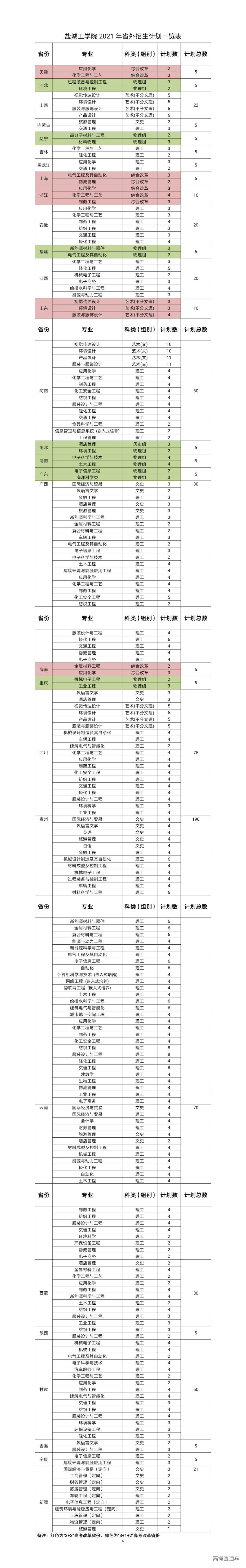 盐城工学院2021年分省分专业招生计划