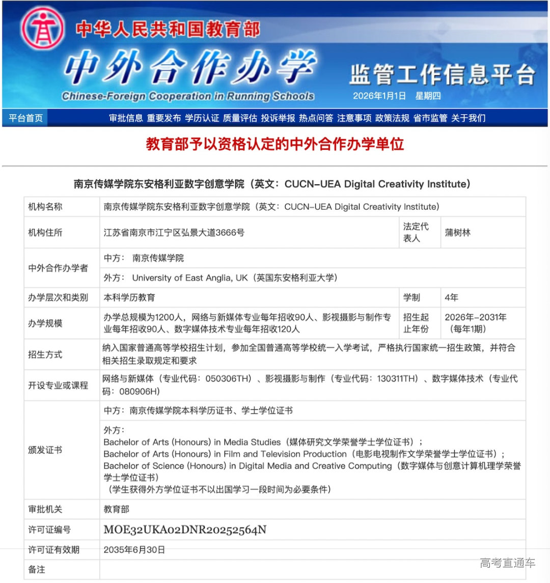 12月31日,经教育部审批,南京传媒学院与英国东安格利亚大学合作举办的“南京传媒学院东安格利亚数字创意学院”正式设立(英文名称:CUCN-UEA Digital Creativity Institute;许可证编号:MOE32UKA02DNR20252564N)。这是我校首个中外合作办学机构,实现了高水平国际合作载体的重大突破,标志着南传国际化办学的重要里程碑,填补了数字创意高等教育领域中外合作办学机构的空白。