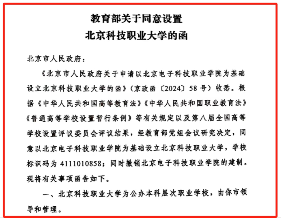 2025年2月21日,教育部正式向北京市人民政府发函,同意设置北京科技职业大学,学校标识码为4111010858,同时撤销北京电子科技职业学院建制,同意首批设置合成生物技术、汽车工程技术、机械电子工程技术、自动化技术与应用、集成电路工程技术、数字媒体艺术等6个职业本科专业。
