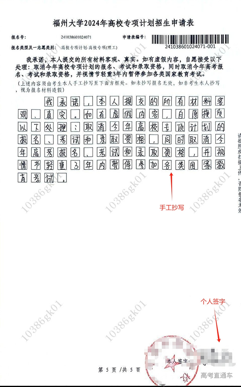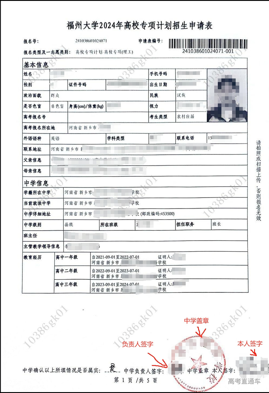3.《高校专项计划申请表》:该表通过报名系统打印,第1页由中学负责人签字并加盖学校公章同时需本人签字,其他页由考生本人签字。