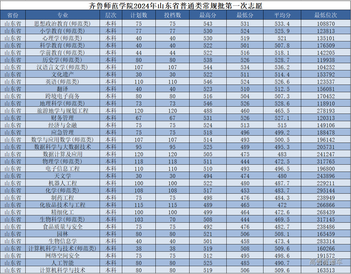 齐鲁师范学院2024年普通类常规批第一次志愿已录取结束,具体情况详见下表:
