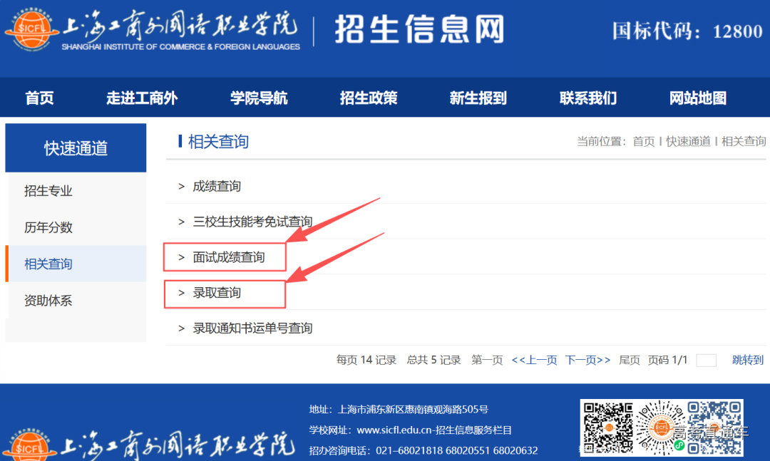 查询流程及注意事项 1.查询流程 考生于2026年3月16日14:00起登录我校招生信息网(https://zs.sicfl.edu.cn/),点击“相关查询”模块中的“面试成绩查询”查看考试成绩(包括综合面试成绩和综合素质评价成绩),点击“录取查询”查看预录取结果。 ▽ 2.注意事项 凡在上海市教育考试院成功填报志愿且完成缴费的考生,未申请、未通过“免笔试、面试入学”面试审核或缺考自招面试的考生,须参加3月21日笔试,笔试准考证将于3月18日14:00-3月21日10:45提供在线打印。 3.预录取名单将在我校招生信息网上进行公示,公示无异议的考生,于4月10日后通过中国邮政EMS发放录取通知书,请考生耐心等待。