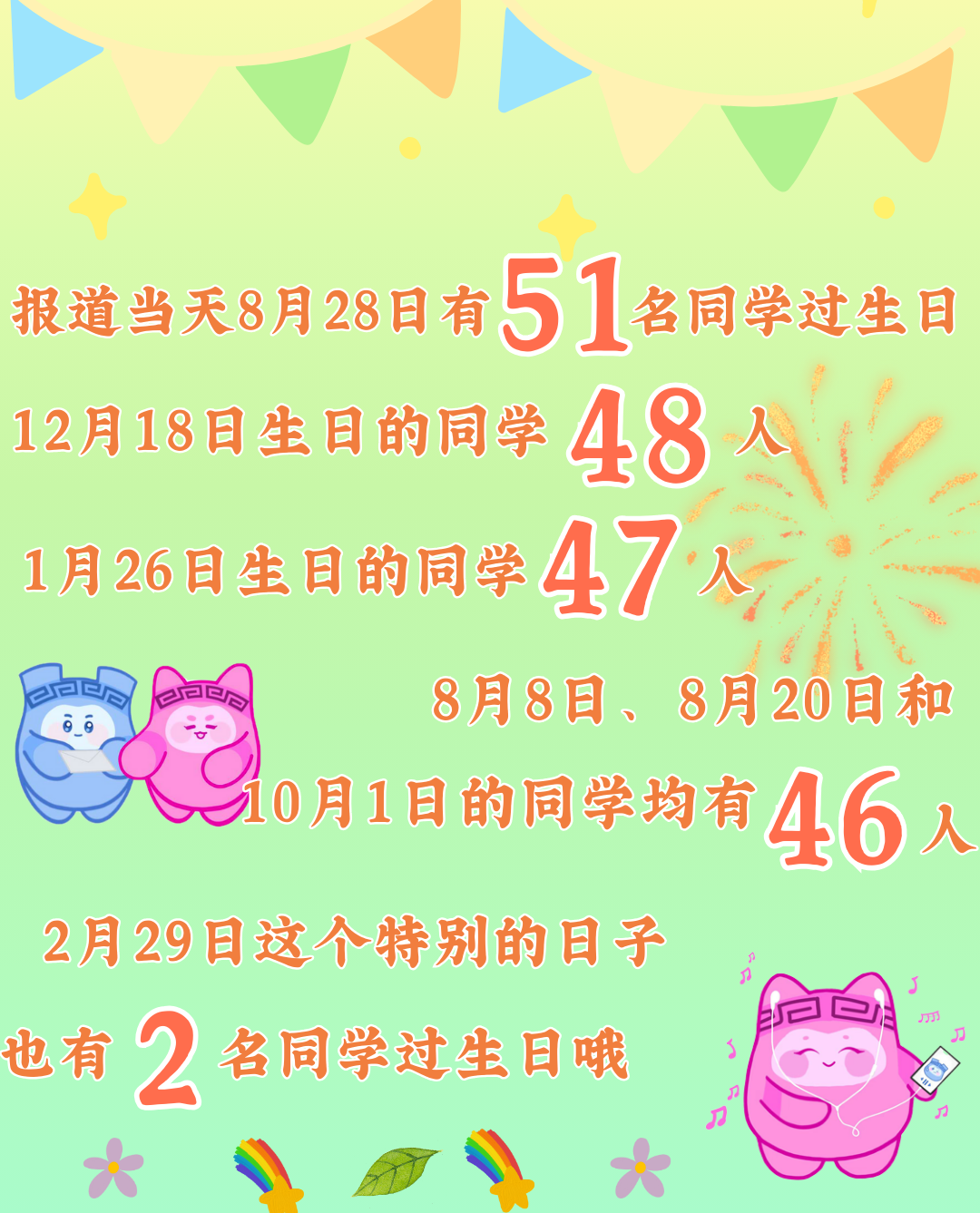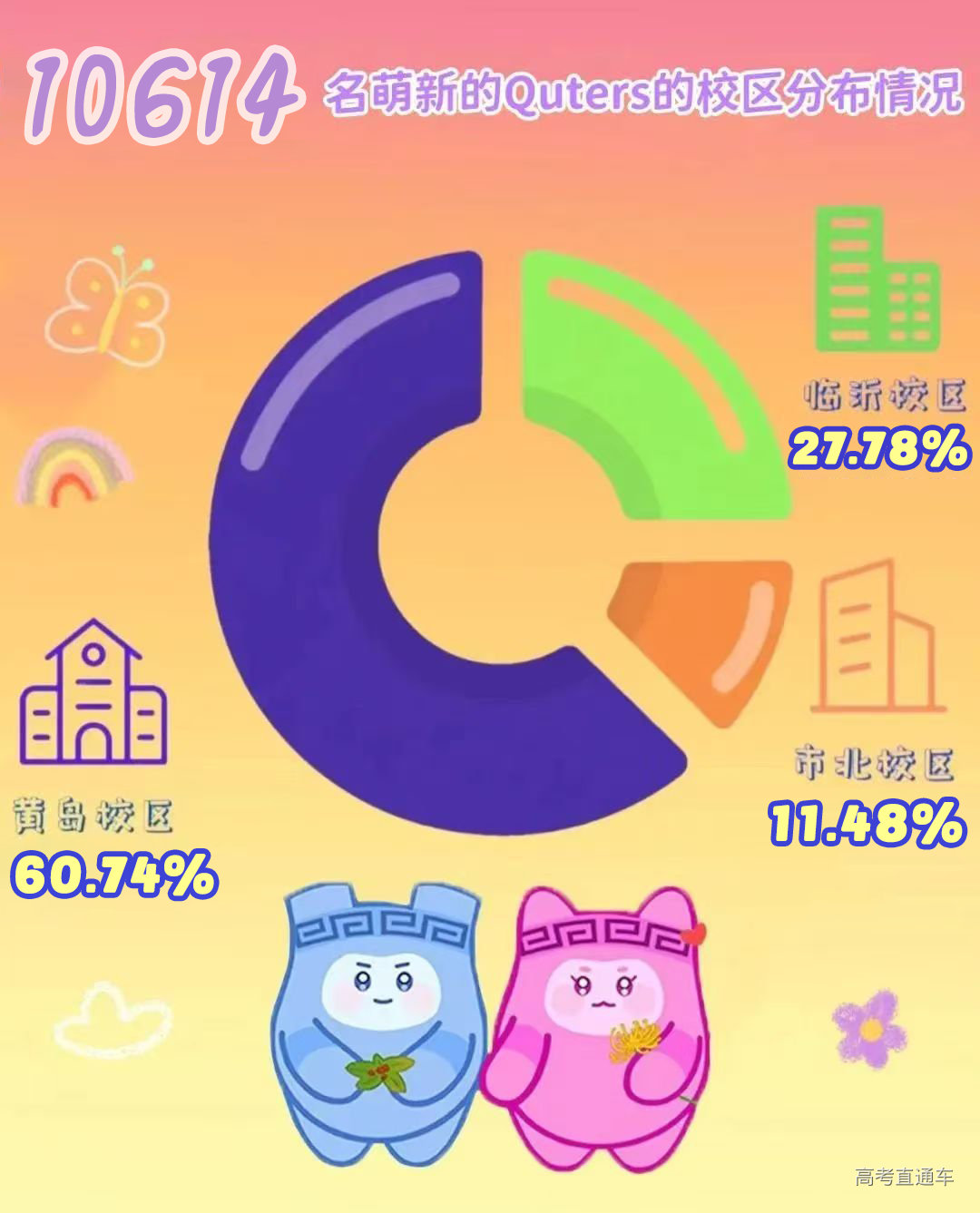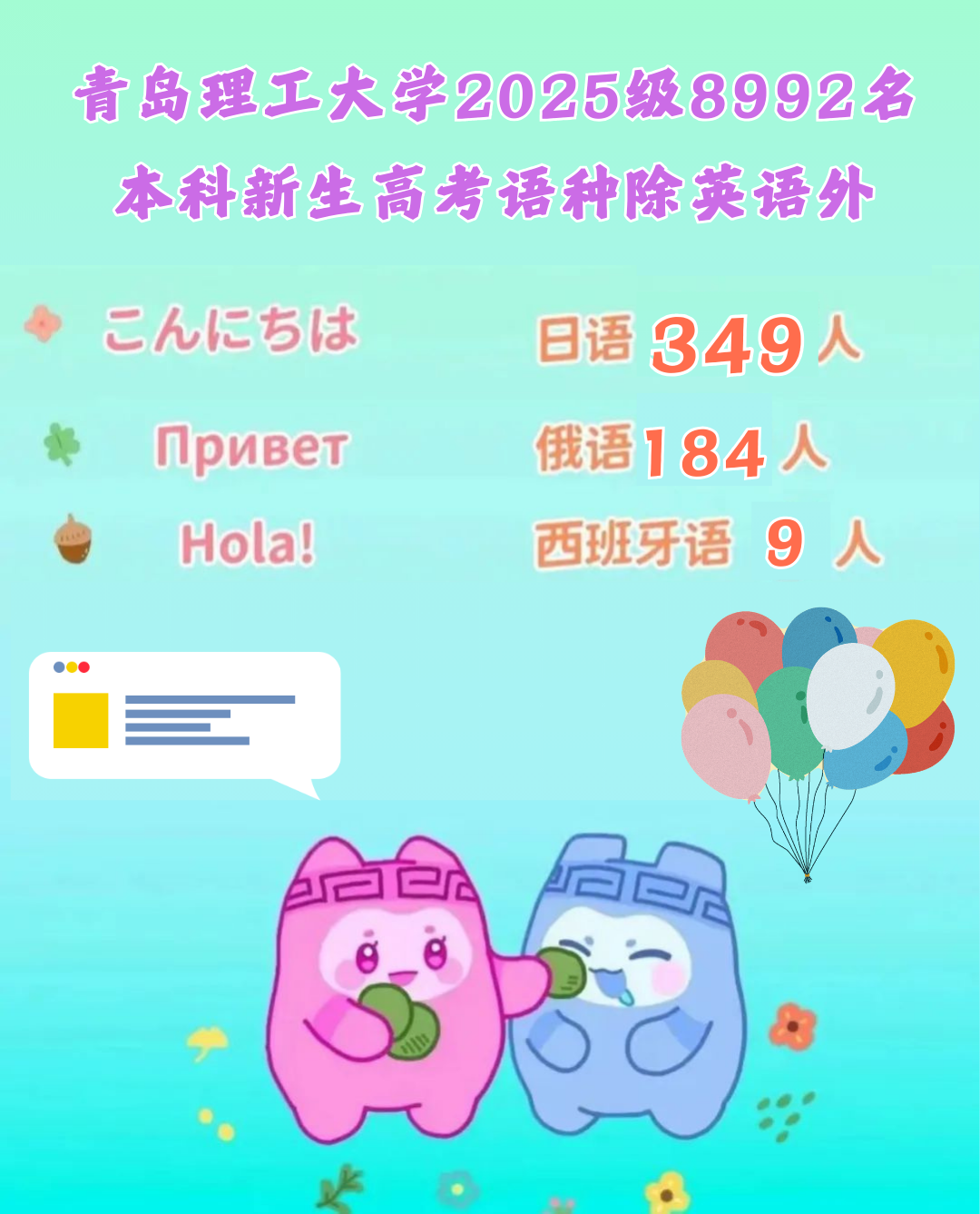 秋天来临之际 QUT注入了崭新的活力 我们欣喜地迎来了来自全国的 10614名 2025级新同学 “ 想知道你的同学们都来自哪些地方? 各学院的男女比例? 有多少人和你同年同月同日生? 新生数据大揭秘来啦! 快来跟上小鼎的脚步用数据的形式 提前认识一下我们的新朋友们吧! ” 你想知道的 都在这里! 2025年 共有10614名新生走进了这“理“ 青岛理工大学 期待与你相见 欢迎新同学! JOIN US 2025级新生男女比例大揭秘! 是否如你预想的那样呢? 不同的乡音里藏着共同的期待, 不同的民族血脉中奔涌着同样的热忱。 你们跨越山川湖海, 终在青理相逢! 还有“组班”而来的小伙伴, 快找找身边的高中校友, 让这份缘分从校园延续! 2025级新生姓氏TOP4看这里! 王1049人 张913人 李868人 刘701人 还有126个姓氏能够识别唯一一位同学! 快来看看有没有你的姓氏 在青理, 遇见世界上的另一个你。 名字相同的同学, 注意点名时不要出现乌龙哦! 8月28日报到当天竟有51名同学过生日 让我们祝他/她生日快乐! 高考不同语种的新同学们, 快来露一手!