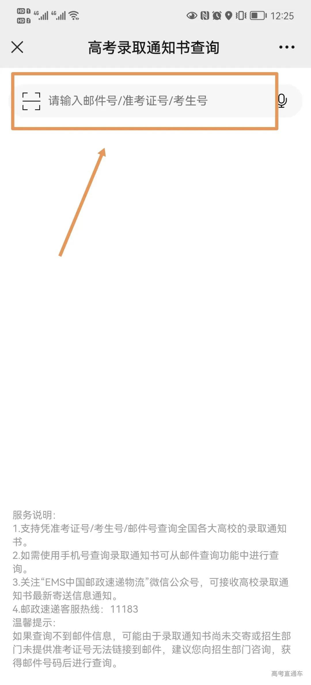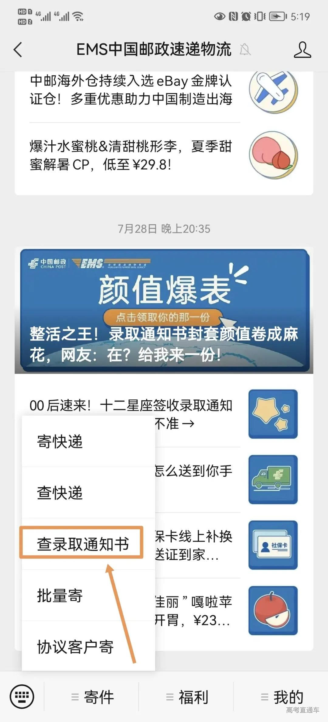 关注”EMS中国邮政速递物流“官微,点击主菜单栏寄件—查录取通知书,进入快递查询页面,输入邮件号/考生号查询快递。