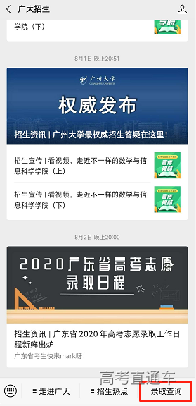 录取专业查询 一、广州大学本科招生网(8月10日以后按录取批次公布) 二、“广大招生”微信公众号(8月10日以后按录取批次公布) 防诈骗温馨提示 与此同时,招生季也是诈骗高发期,骗徒会趁机谋取钱财或个人信息。下面小招帮大家识破骗局,避免上当受骗。 骗局一:冒充高校招生人员 不法分子通过假冒高校招生人员,进行伪造文件、私刻印章,设立报名处等行为,谎称有“内部招生”名额、“定向招生”计划,让家长先付定金进行诈骗。 温馨提示:我校从没有委托任何机构或组织进行招生录取工作,招生录取工作相关消息会第一时间在广州大学本科招生网和“广大招生”公众号公布。 骗局二:混淆学历类型招生 不法分子故意混淆普通高等教育与高等教育自学考试、成人高等教育、现代远程教育等的区别,声称只要交钱就可以上大学,最后把学生介绍进入所谓的“野鸡大学”或是非全日制大学,从而骗取钱财。 温馨提示:国家规定严禁收取与录取挂钩的任何费用。凡违反国家规定的收费行为,或另收取中介费的行为皆为骗局。 骗局三:以“自主招生”“高水平艺术团”“高水平运动队”等特殊类型招生为幌子行骗。 一些骗子利用特殊类型政策,声称可以搞到特殊类型招生资格,然后拿假资格证书蒙骗考生家长。 温馨提示:具有特殊类型招生资格的高校均在教育部“阳光高考”网站公布了特殊类型招生章程,获得资格的考生均在该网站公示,未经公示的考生不具备录取资格。 骗局四:伪造录取通知书 不法分子通过给考生寄送伪造的录取通知书,让考生将学杂费在入校前打入银行账户进行诈骗。 温馨提示:考生收到录取信息确认表或录取通知书后,应登录市教育考试部门网站或主动拨打教育考试部门电话进行核查。 骗局五:利用所谓“预科生”进行诈骗 国家规定不允许超计划、无计划招生,以假“预科生”名义进校后不能办理录取手续,不能电子注册和取得学籍。近几年少数高职高专院校,承诺“先上车后买票”“专科进本科出”。一些不法分子借机而动,四处搜罗生源,向违规招生高校推介,向家长收取巨额好处费、信息费。 温馨提示:我国高考实行“阳光工程”,各高校所有招生计划由国家统一下达并向社会公布,未经批准公布的均不能安排招生。除了省教育考试院外,没有其他任何机构或个人可以办理普通高校招生录取手续。