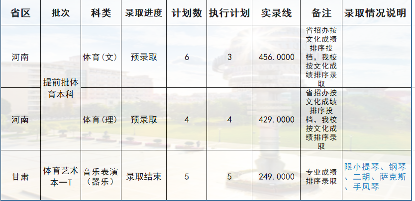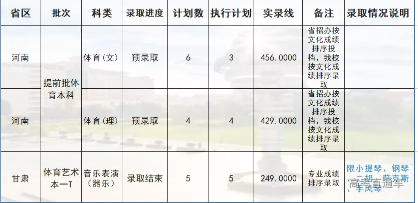 8月6日上午,根据甘肃省教育考试院2020年招生录取工作安排,我校开展了甘肃省体育艺术本一批次录取工作,标志着我校2020年招生录取工作正式拉开帷幕。该批次我校共投放计划5名,投档人数37人,7日上午顺利结束了该批次的网上录取工作。从具体投档情况看,该批次录取最低分249分(音乐表演器乐类专业分),较2019年增加了31分,生源情况优良。